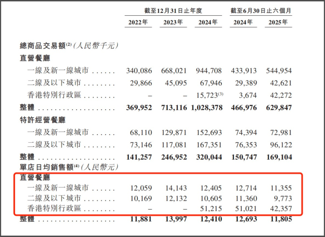 值得注意的是,2025年上半年,遇见小面直营餐厅一线及新一线城市订单总数约为0.18亿单,同比增长38.46%;但2025年上半年遇见小面直营门店单店日均销售额约为1.12万元,较2024年同期的1.24万元,反而减少了约11.02%。