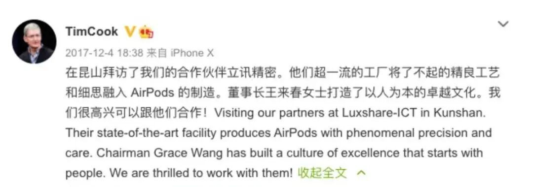 2017年12月,苹果CEO库克在参观立讯精密工厂后,对其生产技术给予高度评价,特别称赞了AirPods制造过程中体现的卓越工艺与精细化管理。