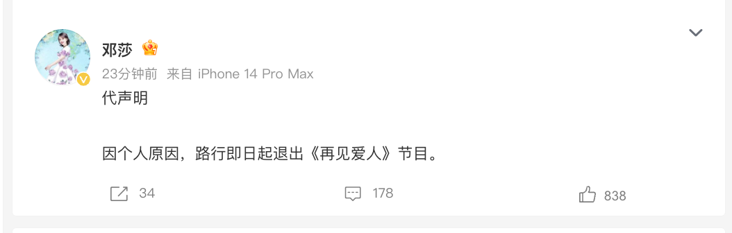 10月24日,女演员邓莎发文“代声明”,因个人原因,路行即日起退出《再见爱人》节目。 据此前报道,10月23日,《再见爱人》节目组官方微博发文称《再见爱人5》将调整播出计划推迟上线。 路行与邓莎 《再见爱人5》节目剧照 近期,演员邓莎的丈夫路行因行贿风波陷“塌房”争议。