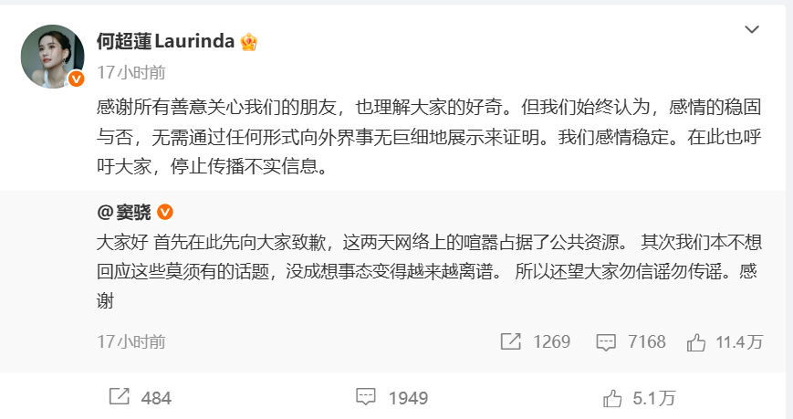 随后何超莲也转发回应,表示:“我们感情稳定,没必要向外界事无巨细展示。”
