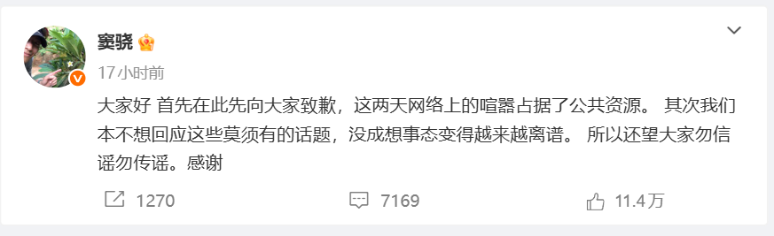 “本不想回应这些莫须有的话题,没想到越传越离谱”,呼吁大家“勿信谣,勿传谣”。