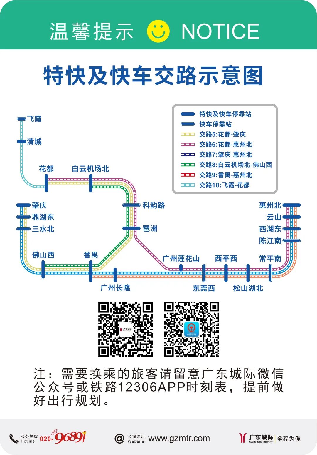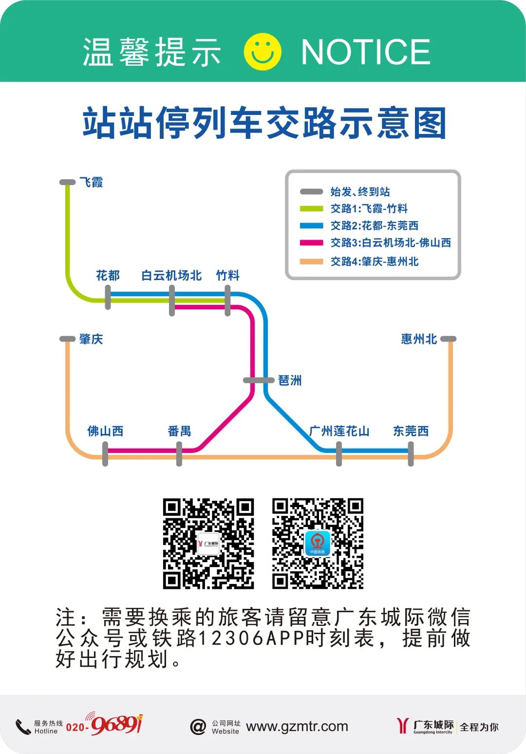 广东城际温馨提醒,运行图调整后,列车开行时间将相应有所调整,旅客可通过“广东城际”微信公众号、12306等提前了解列车发车时间,预留充足换乘时间,以免耽误行程。