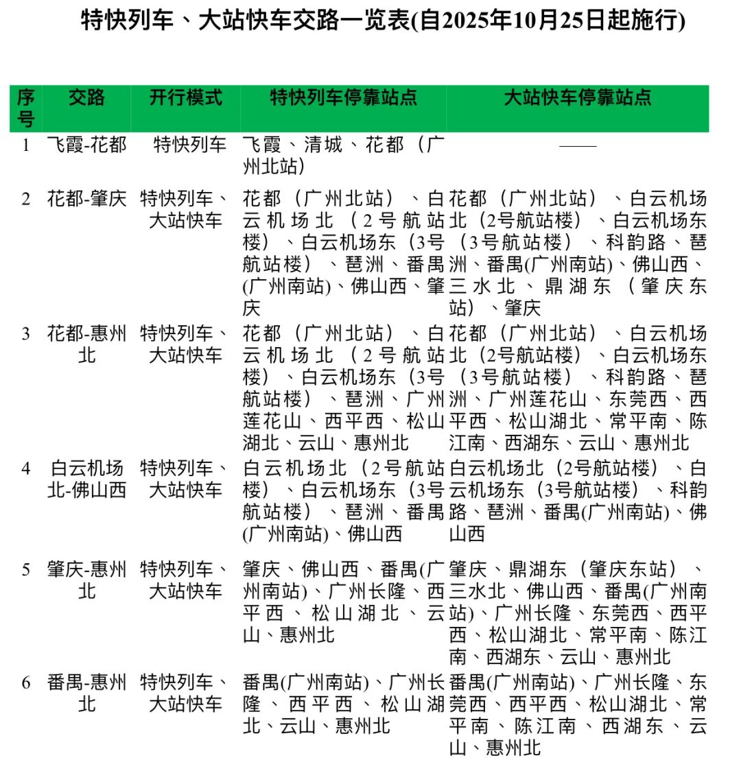 调整后,广东城际全天将开行“飞霞-竹料”“花都-东莞西”“白云机场北-佛山西”“肇庆-惠州北”等四条“站站停”交路,以及“飞霞-花都”“花都-肇庆”“花都-惠州北”“白云机场北-佛山西”“肇庆-惠州北”“番禺-惠州北”特快列车、大站快车交路,实现“线路-客流-运力”的精准匹配,构建更高效的珠三角城际网络。