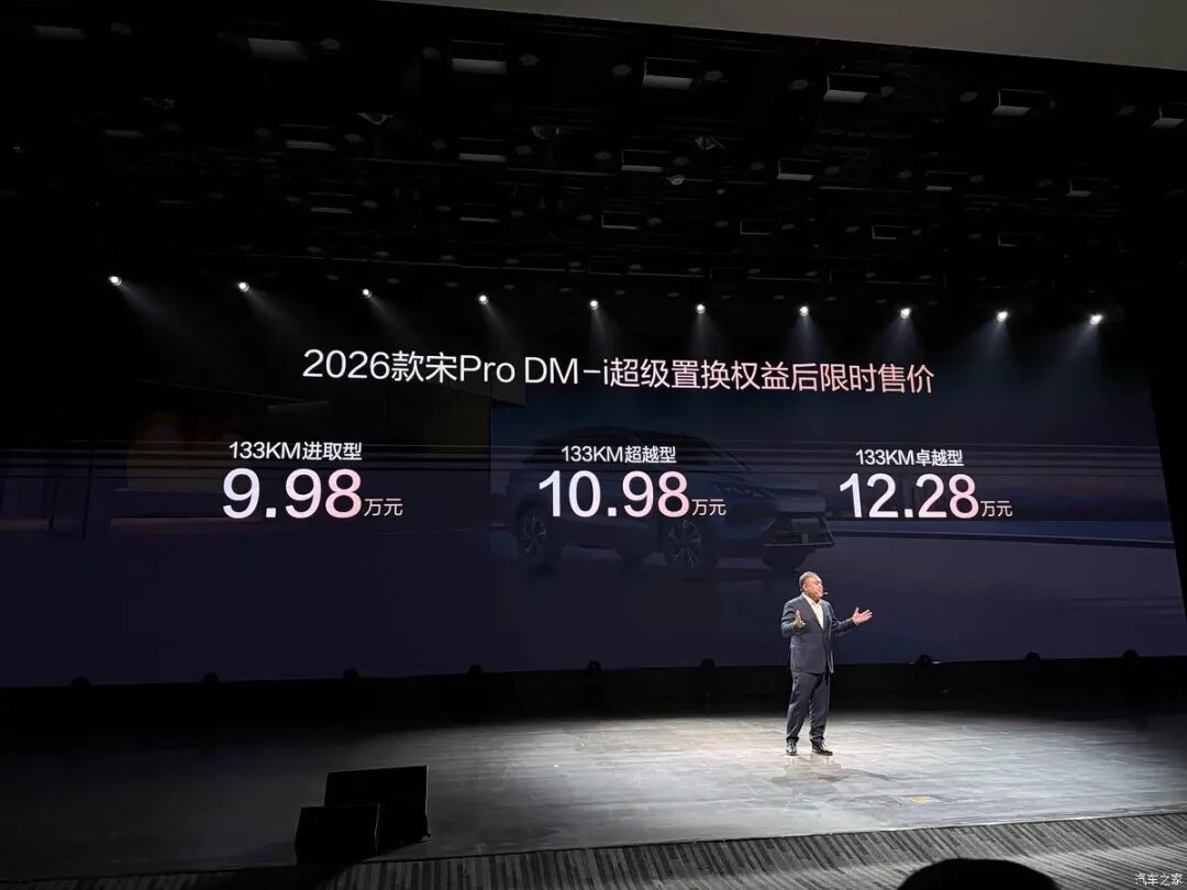 日前,比亚迪在新能源紧凑型SUV市场的当家车型迎来改款,2026款宋Pro DM-i正式上市,新车共计推出3款车型,新车官方售价10.28-12.58万元,超级置换权益价限时9.98-12.28万元。作为年度改款车型,新车主要在座舱、悬架、油耗以及其它细节上进行了优化升级,CLTC工况下纯电续航提升至133公里,产品力进一步提升。根据官方数据,比亚迪宋Pro DM-i在今年上半年已累计销量133919台,这个数据还是非常喜人的。 新车亮点: 外观部分,相信大家对宋Pro DM-i的样子已经非常熟悉了,家族化的设计让它具有很高的产品辨识度。在配置上新车增加了前主动格栅功能,对于发动机快速热机和降低风阻都有一定的积极作用。其它部分保持了现在的造型,毕竟作为一款经典车型,它首先能够在审美上获得更多人的接受,它的这套熟悉的外观在同级中还是很能打的。此次新款车型还增加了冰珀青的外观颜色。 接下来我们来到车内,车内的变化相比外观要更多。其实现款内饰造型从2025款开始使用,在造型风格上走的是简约时尚的路线,8.8英寸液晶仪表+12.8/15.6英寸大屏,内置了比亚迪DiLink 100智慧车机,有着不错的使用感受。 而车内着重的变化在于副仪表台区域,新款车型对此进行了重新设计,首先它采用全新的怀挡设计,这样进一步释放了副仪表台的空间,空调出风口下方是50W的手机无线充电面板,后面依次是保留了部分高频功能的物理按键,比如驾驶模式切换、自动泊车、EV/HEV切换、前风挡玻璃除雾等等,简化了部分功能,看上去要更简洁明了。 此外在智能座舱部分,它具备丰富的娱乐功能,诸如:无麦K歌、游戏中心、成语接龙功能,手车互联功能支持镜像模式、导航流转、音乐接续、大屏观影,还有智能防晕车功能、萌宠、3D动态裸眼主题等,让用车变得更加有趣。 动力部分,新款车型将继续搭载大家熟悉的1.5L+电动机的插电混合动力,发动机和电动机的功率分别是74和120千瓦;CLTC工况下纯电续航提升至133公里,更长的续航里程将会进一步降低充电的频次,适应更多的应用场景,NEDC亏电油耗3.2L/100km。新车配备前麦弗逊式独立悬架和后多连杆式独立悬架。 新车背景: 在紧凑型SUV市场中,宋Pro新能源一直都是比亚迪旗下的王牌产品,不俗的产品力加上它合理的定价区间,让它有着非常不错的销量表现。新款车型是一次有针对性的升级,将王朝家族最新的设计上身之后,加上增加更长续航版本的车型,都让它的产品了进一步提升,在竞品车型持续紧追的当下,不断的持续自我革新,才是保持长期竞争力最有效的方式。 竞品分析: 宋Pro DM-i 银河星舰7 零跑B10 在竞品方面,诸如当前热门的零跑B10和银河星舰7,它们之间的售价重合度非常高,尤其是银河星舰7,它两之间在价格、配置、纯电续航等关键数据上有着很高的重合度,并且它的起售价格还要更低些。而零跑汽车这两年的表现可是今非昔比,持续多月霸榜新势力月销榜,旗下的零跑B10更是12万+的价格就给配上了激光雷达,可以说是高性价比的代名词,它采用纯电的驱动形式。综合来看比亚迪宋Pro DM-i在产品认知度、综合竞争力等部分的依旧实力十足,不过可以看出市场竞争也会更加激烈。 来源:汽车之家、如有侵权请联系删除