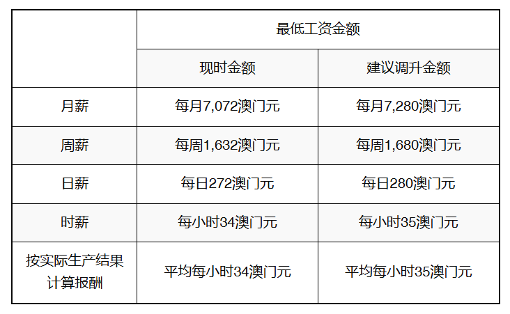 建议自2026年1月1日起调升雇员的最低工资金额:每小时35澳门元,每日280澳门元,每周1,680澳门元,每月7,280澳门元。