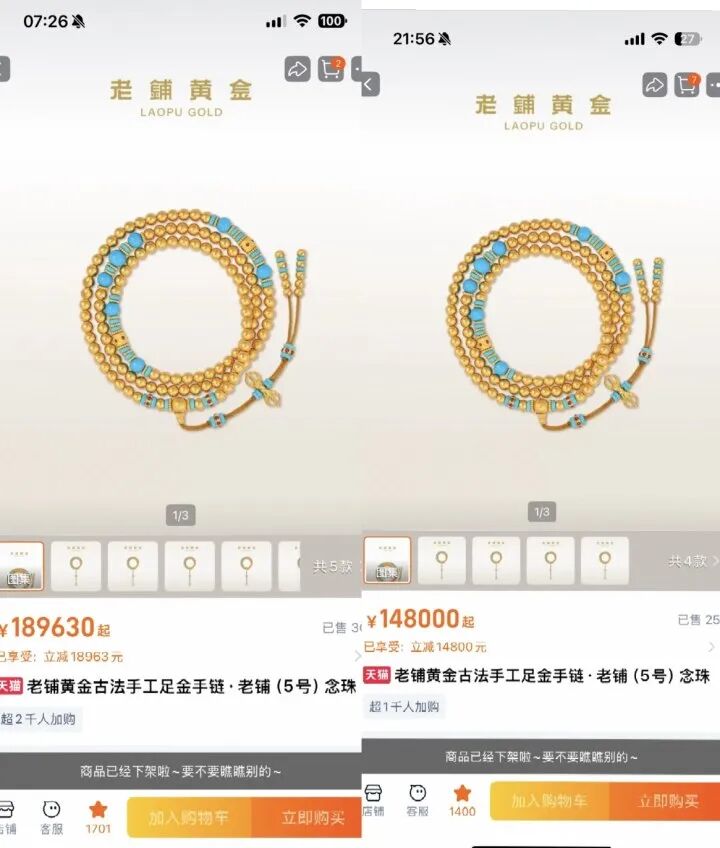 一夜涨了4万多元的108念珠,也是老铺黄金最火的一款产品之一。一条念珠102克左右,从此前的148000元涨到了189630元,涨幅为28%左右。而就在年前,同样一条念珠的公价为9万元左右,一年时间涨了近10万元。