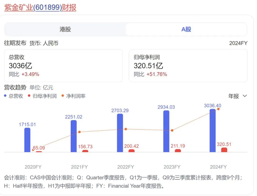 这行情下,紫金矿业手握黄金和铜两大王牌,形成了强劲的“双轮驱动”效应。2024年半年业绩报告中提到,黄金业务营收占比46.5%,铜业务占比29%。