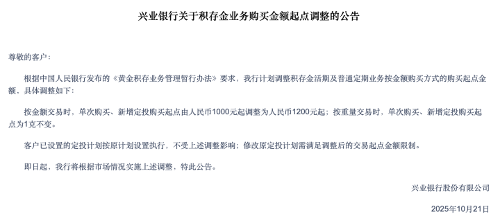 10月21日,兴业银行发布公告称,该行计划调整积存金活期及普通定期业务按金额购买方式的购买起点金额。按金额交易时,单次购买、新增定投购买起点由人民币1000元起调整为人民币1200元起;按重量交易时,单次购买、新增定投购买起点为1克不变。