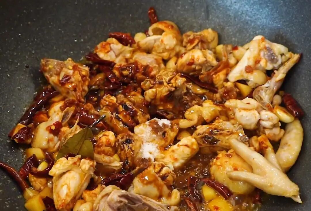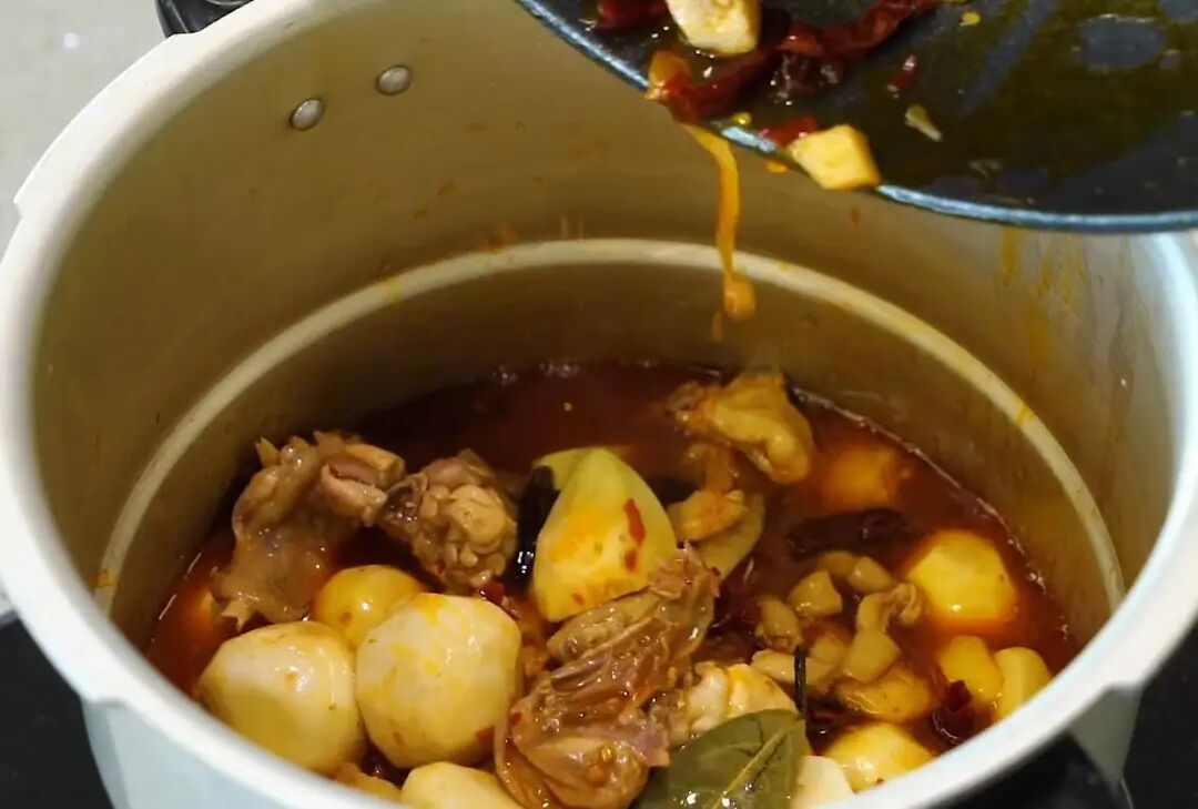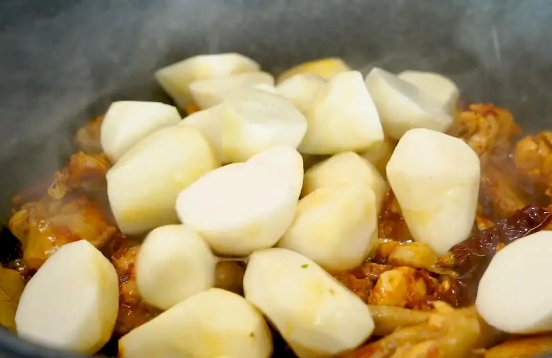 今天和大家分享一道圩儿鸡的做法,这样做出来的芋儿鸡,鸡肉细嫩,芋儿软烂入味,香辣爽口,开胃又下饭,全家人都爱吃。 法: 1,准备好半只鸡剁成小块放入盆中,加入一勺面粉抓一抓,抓到表面黏稠用流水冲洗干净,控干水分备用。 2,准备好一些辅料:生姜去皮切成小片,大蒜切片,一把干辣椒清洗干净剪成两半,几根香菜切碎。 3,准备好几个芋头戴上手套去皮,放入清水中浸泡避免氧化变黑。 4,起锅烧油下入姜蒜炒出香味,再倒入清洗干净的鸡块翻炒。 5,炒到鸡肉变成白色后拨到一旁,加入一勺郫县豆瓣酱,干辣椒,桂皮,香叶,八角,花椒,炒出红油。 6,炒出红油后加入一勺食盐,一勺生抽,翻炒均匀。 7,下入芋头翻炒均匀,加入清水和食材一平即可。 8,把芋头鸡肉和汤汁一起倒入高压锅中,盖上盖子上汽后煮6分钟关火。 9,高压锅气体完全放完之后开盖,倒入一个小盆中撒上一点香菜我们的芋儿鸡就做好了。颜值高香味扑鼻,鸡肉细嫩,芋儿软烂入味,香辣爽口开胃又下饭。