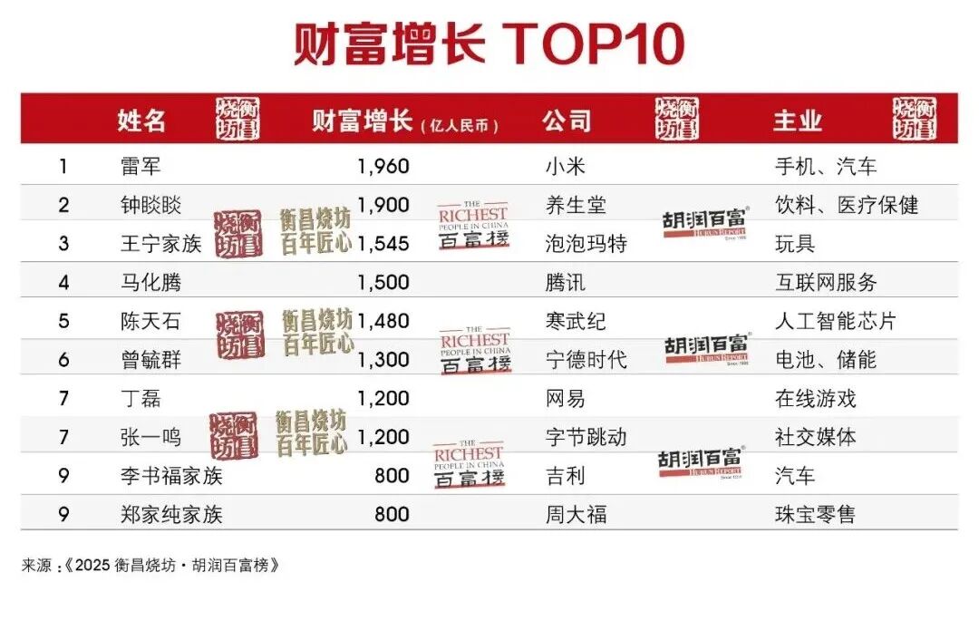 红星资本局10月28日消息,今日,胡润研究院发布《2025衡昌烧坊·胡润百富榜》。今年是胡润研究院自1999年以来连续第27次发布“胡润百富榜”,财富计算截止日期为2025年9月1日。 榜单显示,农夫山泉钟睒睒、字节跳动张一鸣、腾讯马化腾位居榜单前三位。翰森的钟慧娟以1410亿元取代娃哈哈的宗馥莉(875亿元)成为中国女首富。 今年共有1434位个人财富50亿元人民币以上的企业家登上胡润百富榜,比去年增加31%(+340位);总财富接近30万亿元,比去年增长42%(+9万亿元)。千亿级企业家增加15位,达41位;十亿美金级企业家增加268位,至1021位。 前十迎来两位“新面孔”:小米雷军与吉利李书福。前十门槛比去年提高600亿元至2250亿元;平均年龄62岁,比去年年轻3岁。 71岁的农夫山泉创始人钟睒睒财富增长1900亿元,以5300亿元第四次成为中国首富,并刷新了中国首富的财富纪录。旗下产品红瓶矿泉水业绩稳定,新品牌如东方树叶等销量增加,带来整体业绩增长。 42岁的字节跳动创始人张一鸣以4700亿元位居第二,让出去年首富头衔。他的财富增长1200亿元,这得益于AI业务进展推动公司估值继续走高。根据第三方机构QuestMobile的数据,截至2025年8月,字节跳动旗下AI助手“豆包”月活跃用户达到1.57亿,位居国内第一位。 54岁的腾讯创始人马化腾财富增长1500亿元,以4650亿元保持第三。今年上半年,游戏、广告、金融科技三大主业协同拉动腾讯业绩增长。 1198位企业家财富比去年增长,小米的雷军成为“增长王”,财富比去年增长1960亿元,主要得益于小米汽车业务的爆发式增长和手机高端化突破带来的盈利跃升;其他增长较快的企业家还包括泡泡玛特38岁的王宁,凭借Labubu全球爆红,财富增长1545亿元;寒武纪40岁的陈天石则凭AI芯片落地加速,业绩增长迅速,8月底股价一度超越茅台,财富增长1480亿元。 本次榜单还有376位新上榜,数量为去年的7倍。新人之首是老铺黄金的徐高明、徐东波父子,以695亿元财富跻身前100;其次是集换式卡牌龙头卡游的李奇斌、齐燕夫妇,财富600亿元。新人前十还包括智能影像设备企业影石34岁的刘靖康与其妻子潘瑶,财富385亿元。此外,“奶茶”界知名品牌古茗、霸王茶姬和沪上阿姨成功上市,创始人39岁的王云安、30岁的张俊杰和47岁的单卫钧与其妻子周蓉蓉分别以185亿元、135亿元和95亿元财富首次上榜。 此外,2025年胡润百富榜女企业家占22.4%,比去年下降1.1个百分点,超过七成白手起家。翰森的钟慧娟以1410亿元取代娃哈哈的宗馥莉(875亿元)成为中国女首富。