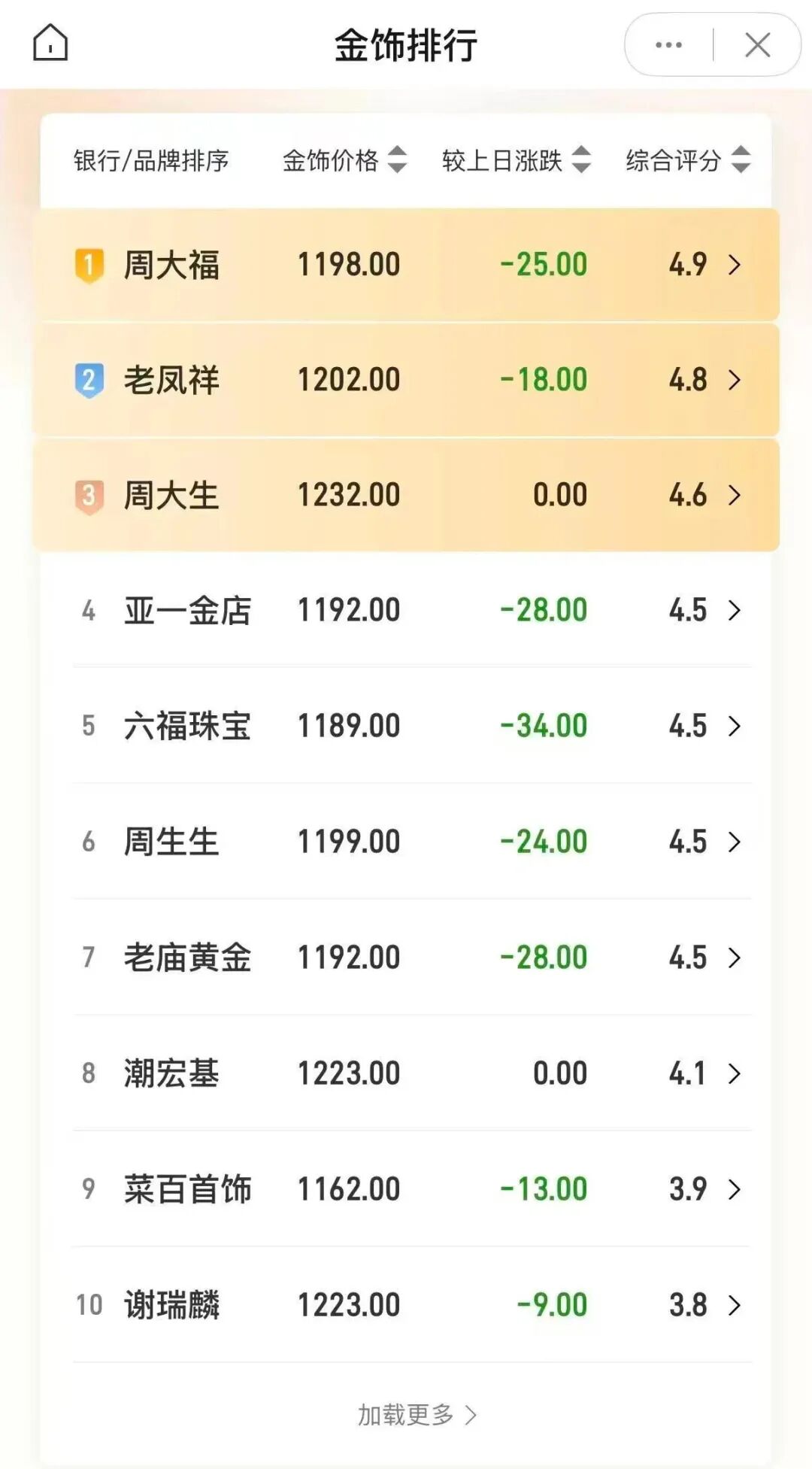 国际金价下跌,国内金饰零售市场价格也随之调整。今日上午,周大福金饰挂牌价调至1198元/克,较昨日下跌25元/克;六福珠宝跌破1200元/克至1189元/克,较昨日下跌34元/克。