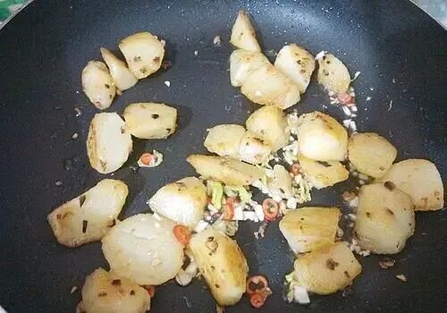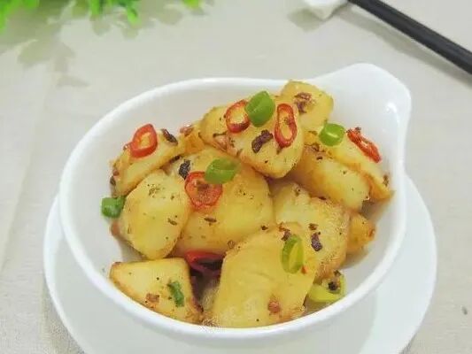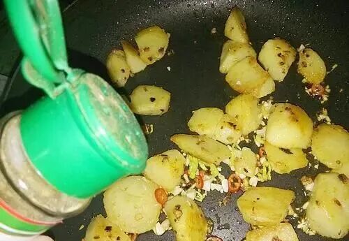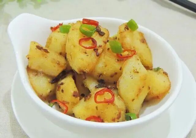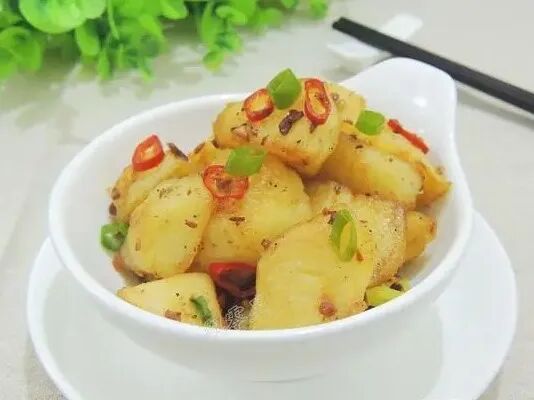 土豆的做法有很多, 今天换一种方式吃土豆,推荐这一道椒盐土豆。采用干香的烧法,先煮熟然后煎,加入孜然、椒盐、辣椒粉,几分钟就能做一锅,包裹着调料的土豆块吃起来焦香四溢,大人孩子都喜欢。 【孜然椒盐土豆】 【食材】:土豆 2个,食用油,椒盐,孜然粉,辣椒粉,大蒜,青尖椒,红尖椒,小葱。 【具体制作步骤】: 1.土豆清洗干净以后削去外皮,改刀切成滚刀块。 2.锅中放入清水,将土豆块放入锅中,煮至土豆熟透,用筷子能够轻松穿透就可以了。 3.青红尖椒分别清洗干净,切成小圈,大蒜切成蒜末备用。 4.锅烧热,放入食用油,油热以后,放入一半的蒜末煸炒出香味,然后将土豆放入锅中。 5.用小火将土豆四面都煎至颜色金黄,盛出备用。 6.锅中放入一勺食用油,油热以后将剩下的蒜末放入锅中,煸炒出香味以后,放入一半的辣椒圈,把土豆放入锅中翻炒一下。 7.接着放入适量椒盐、孜然粉、辣椒粉,颠动锅,让土豆块和调料粉混合均匀。 8.最后把剩下的辣椒圈全部放入锅中,再次翻炒均匀,撒一些葱花就可以出锅装盘了。 【小贴士】: 1.如果有小土豆的话就不需要切了,煎至金黄,用铲子稍微压碎一些,更容易入味。 2.喜欢吃辣味的话就多多的放辣椒粉和尖椒吧,不喜欢就可以省略啦。孩子吃的话可以做成原味的,蘸着番茄沙司吃,也是很好的。