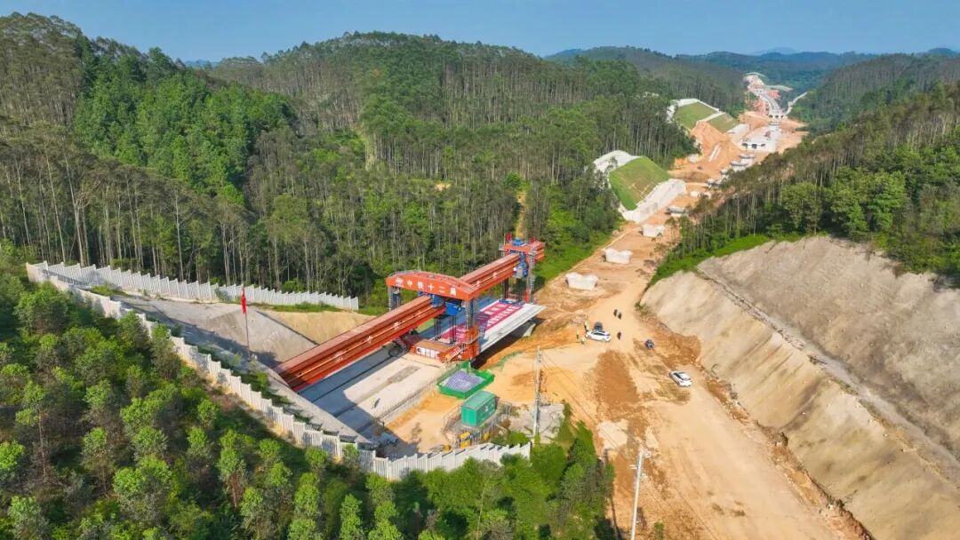 ▲深南高铁跨S51肇阳高速公路特大桥首榀箱梁架设。图源:深南铁路公司