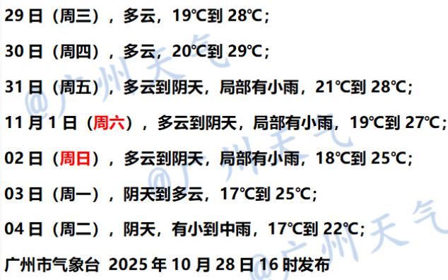 入秋后的广州 并未显得特别寒凉 未来两天气温还会有小幅度回升 但另一方面, 冷空气没有闲着, 10月31日起将补充影响广州, 气温逐渐下降至17~25℃。
