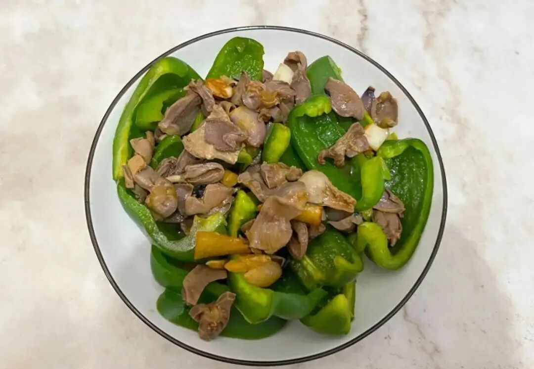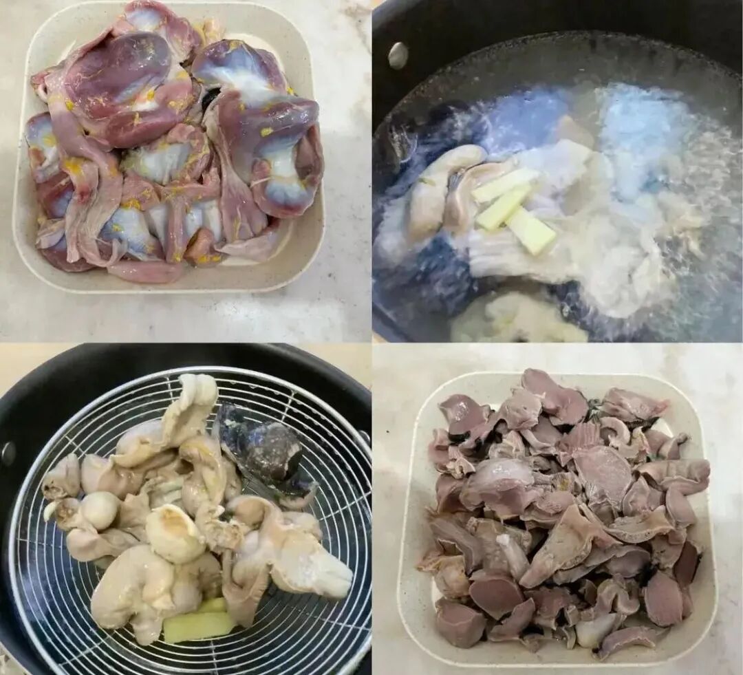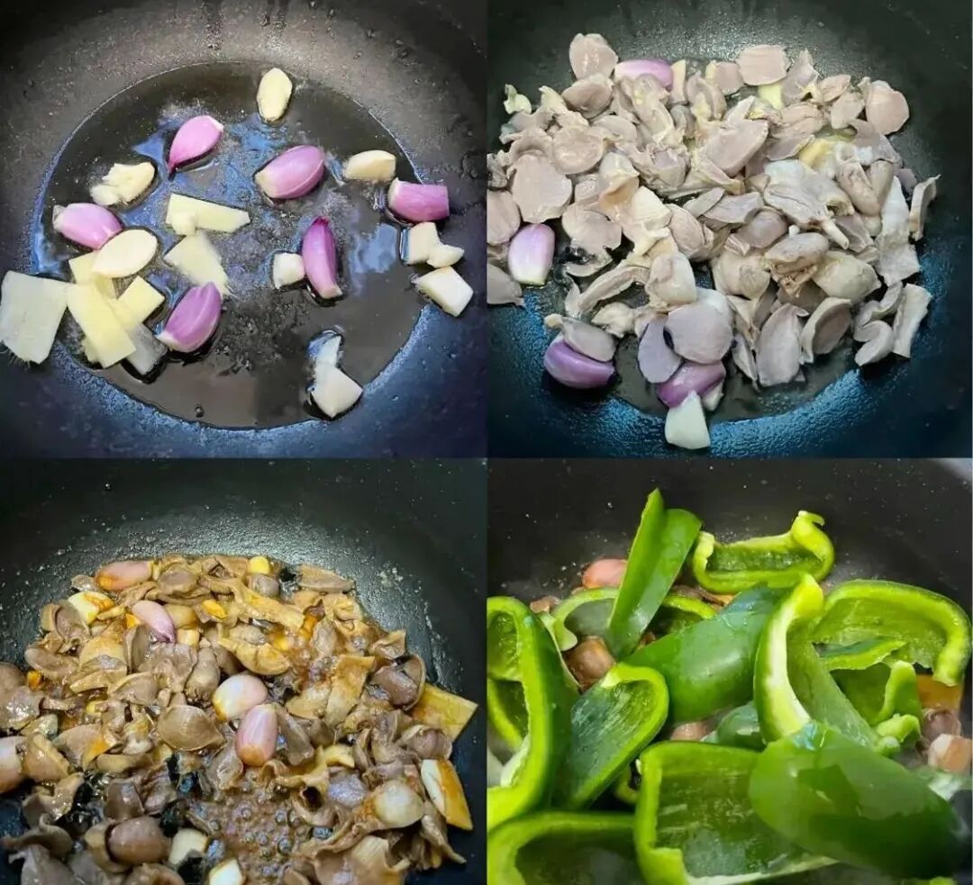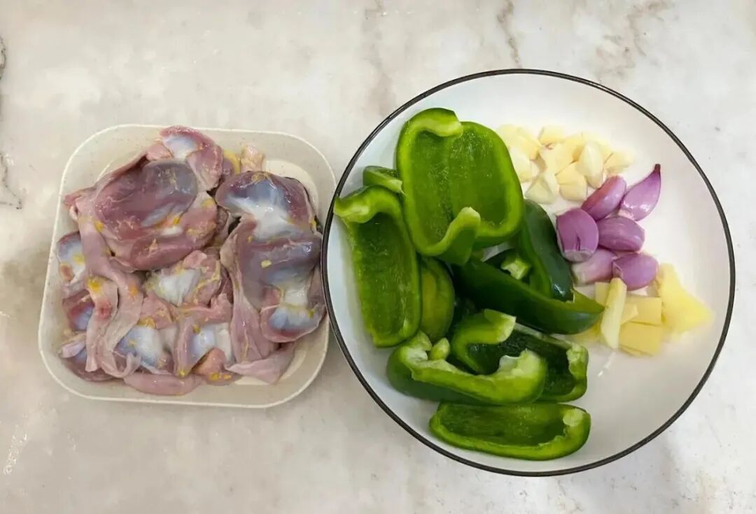 食材:鸡胗、青椒、姜、蒜、红葱头
