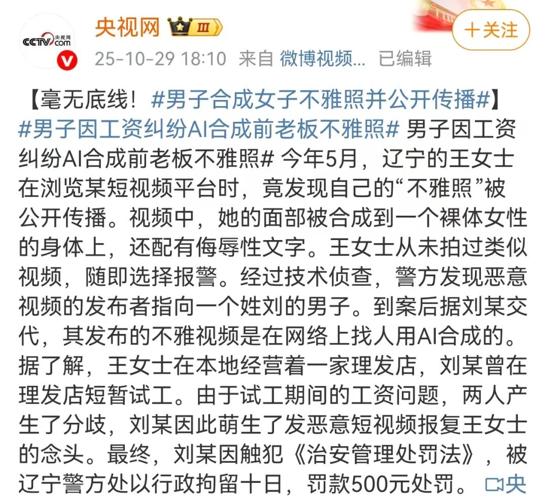 : 据@央视网10月29日报道,近日辽宁沈阳警方公布了一起利用AI技术合成他人不雅视频并恶意传播的案件。今年5月,辽宁的王女士在浏览某短视频平台时,竟发现自己的“不雅照”被公开传播。视频中,她的面部被合成到一个裸 ...