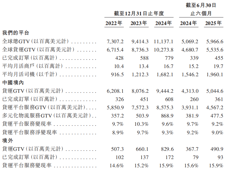 招股书显示,2025年上半年,其以59.67亿美元的全球交易总额(GTV)继续坐稳“全球最大闭环货运交易平台”宝座,市场份额为53.3%,同时包揽“全球最大同城物流交易平台”“全球月活商户最多物流平台”等多项桂冠。