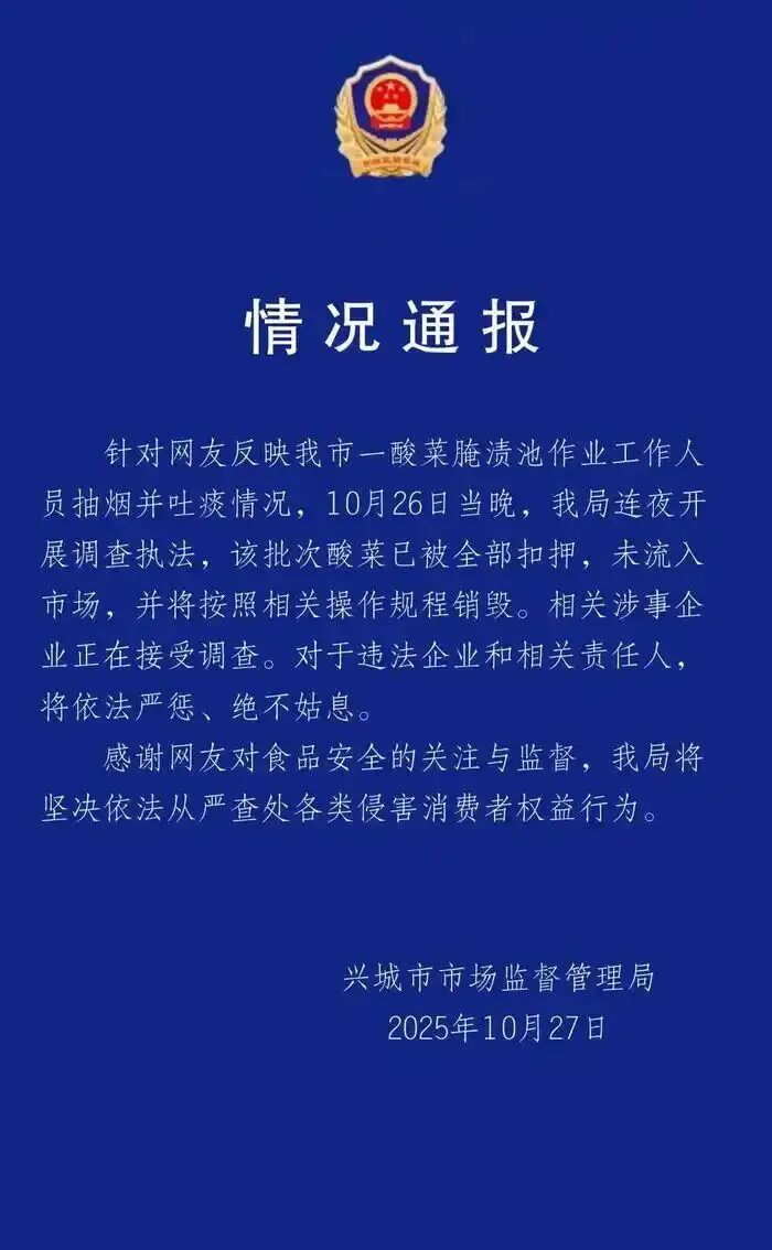 当地有关部门迅速介入并发布情况通报,表示该批次酸菜已被全部扣押,未流入市场,并将按照相关操作规程销毁,相关涉事企业正在接受调查。