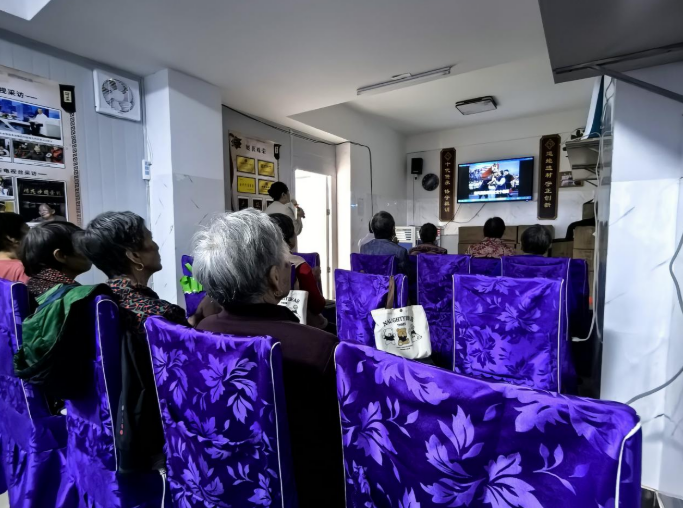 记者进入时,已有近20位老人端坐其中“上课”。前半个小时,一位手持话筒的女“老师”正带领老人们进行唱歌、拍手等互动。