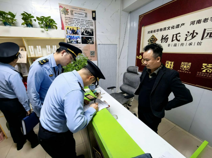 ▲10月27日傍晚,属地市场监管所执法人员对“杨氏沙园非遗传承馆”负责人进行询问。新京报贝壳财经记者俞金旻 摄