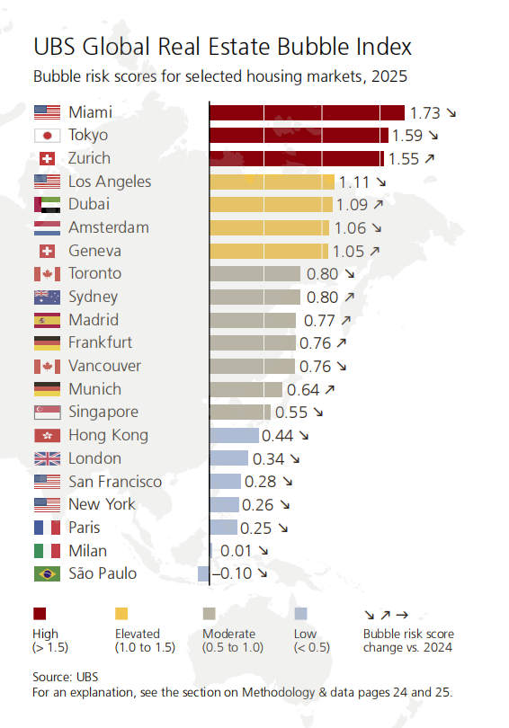 瑞银2025年选择了21个城市研究,其中香港楼市泡沫指数排名第15,评分为0.44,属于“低风险”级别,较2024年度评估的0.74“中风险”有降低。迈阿密显示出最高的泡沫风险,评分为1.73。