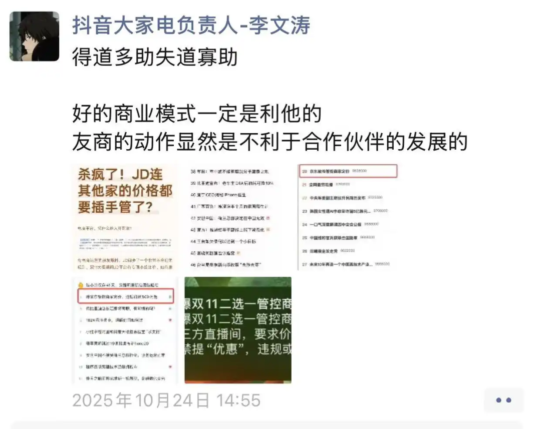随后,抖音大家电负责人李文涛也在朋友圈贴图发文指责京东“得道多助失道寡助”,并称“友商”(京东)的动作显然是不利于合作伙伴的发展的。