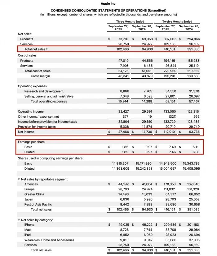 图片来源:界面图库 北京时间10月31日,苹果公司(NASDAQ:AAPL)发布了截至9月27日的2025财年第四季度及全年财报。财报显示,苹果第四财季总营收为1024.66亿美元,创同期历史纪录,较上年同期的949.30亿美元增长8%;净利润达274.66亿美元,较上年同期的147.36亿美元大幅增长86%;每股摊薄收益为1.85美元,较上年同期的0.97美元增长91%,三大核心财务指标均呈现强劲增长态势。 不过,与整体亮眼表现形成对比的是,苹果第四财季大中华区营收为144.93亿美元,较上年同期的150.33亿美元下降3.6%,成为全球各区域中唯一营收下滑的市场,美洲、欧洲、日本及亚太其他地区均现增长。在第三财季,苹果曾凭借降价措施,扭转了大中华区营收连续7个季度下滑的颓势。  苹果2025财年第四季度及全年财报核心数据 图片来源:苹果官网