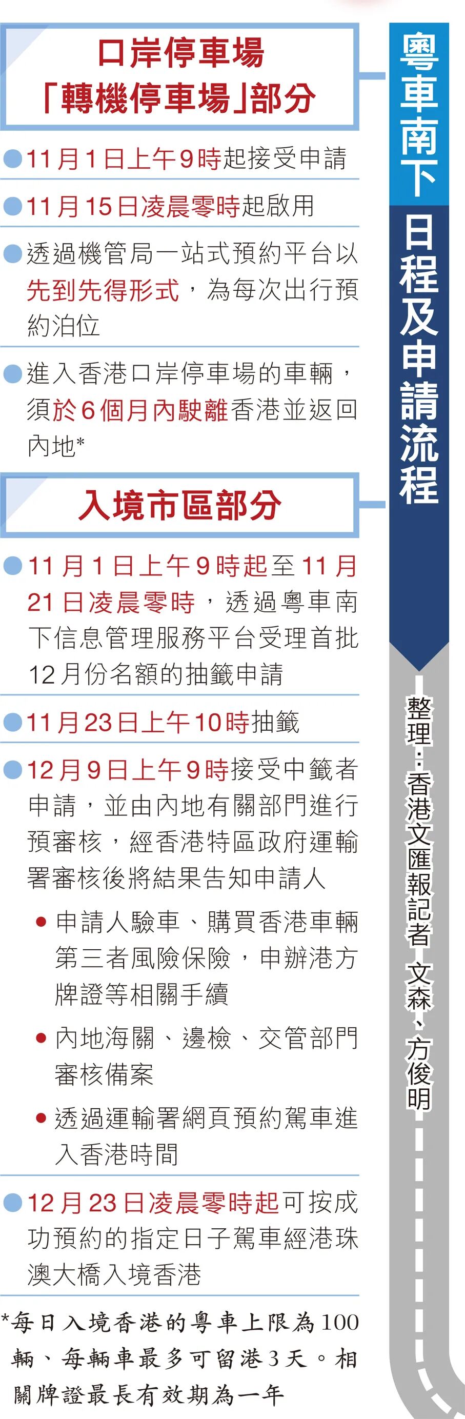 获准的广东私家车车主将可驾车经港珠澳大桥出行。香港文汇报珠海传真 香港特区政府、广东省公安厅、广东省交通运输厅昨日同步公布粤车南下的实施安排。两地政府同意口岸停车场的「转机停车场」于今日(1日)上午9时起接受申请,并于本月15日凌晨零时起启用;入境市区部分亦由今日起接受首轮抽签报名,中签者可于下月9日起提交申请,以期于同月23日凌晨零时起按成功预约的指定日子驾车经港珠澳大桥入境香港。为确保有序实施,粤车南下首批先开放广州、珠海、江门及中山4个城市,半年后推广到全省其他地市。为做好总量管控及提供更好的出行体验,两地政府同意初期每日入境香港的粤车上限为100辆、每辆车最多可留港3天。香港特区行政长官李家超衷心感谢中央及广东省政府一直以来的大力支持,共同推动和落实粤车南下。这安排将与港车北上双轨并行,为粤港澳大湾区融合发展注入更大动能。 他表示,粤车南下与港车北上相辅相成,是推动粤港澳大湾区融合发展的重要举措,「这不仅促进粤港两地居民『双向奔赴』,实现更高水平的人流、物流互通,更同时开启内地居民访港新模式,为香港旅游、零售及餐饮等行业带来机遇。」特区政府正按照确保安全、有效分流、完备配套和简便申请的策略,稳步推行粤车南下,让香港居民和整体社会受惠,共同分享大湾区融合发展的丰硕成果。 在粤车南下计划下,符合条件并经核准的粤车可经港珠澳大桥珠海口岸前往香港口岸人工岛上的自动化停车场(口岸停车场)泊车后,司机和乘客经香港国际机场转乘飞机或入境并转乘香港本地交通工具访港;或在无须取得常规配额下以自驾方式经大桥直接入境并驶至香港市区。 粤车南下进入香港市区政策申请门槛低。图为车辆在广东行驶。香港文汇报记者方俊明 摄