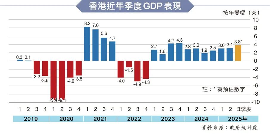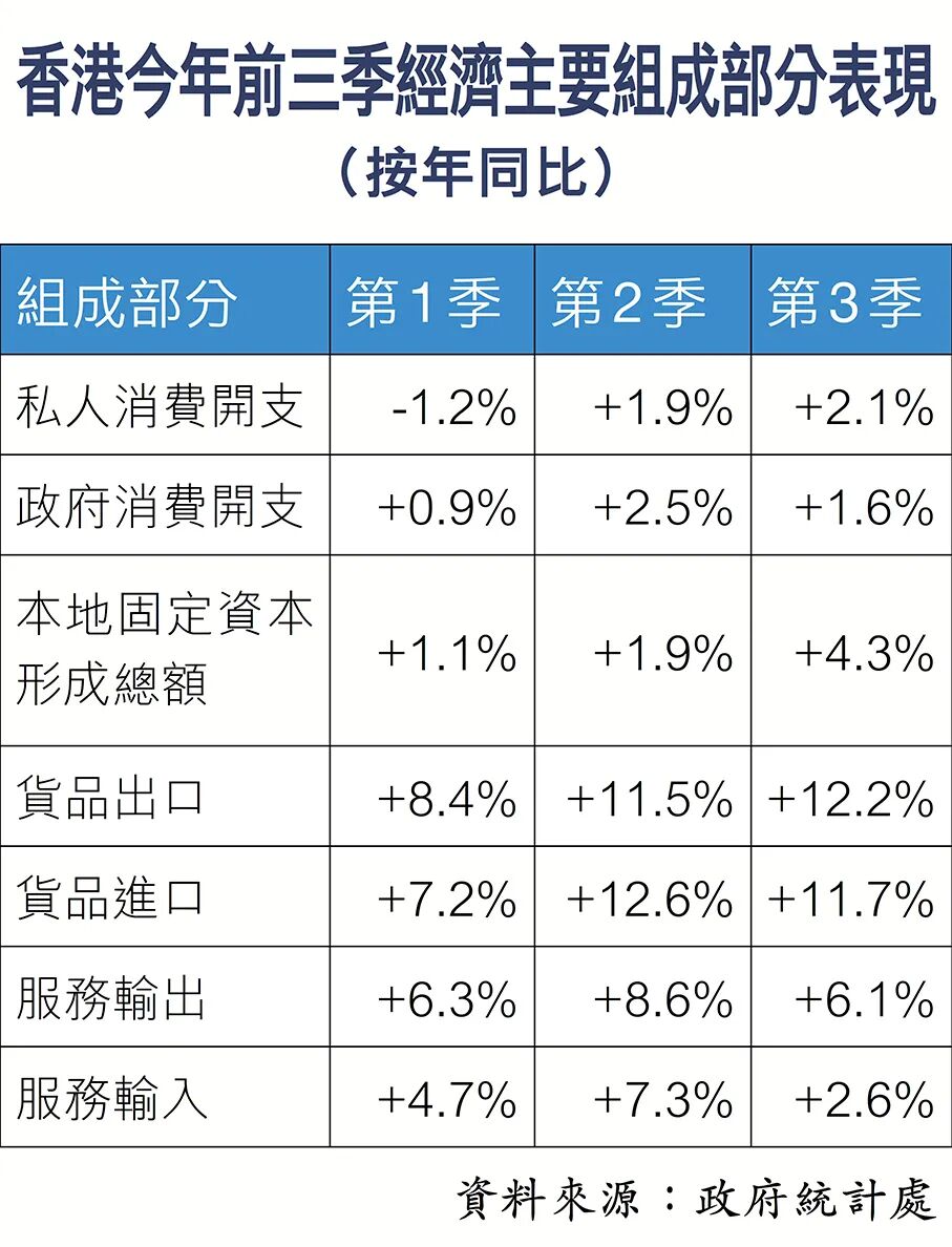 受惠出口、旅游、股市、消费、楼市、整体投资开支等的增长加快,香港第三季经济增长加快、按年同比升3.8%,连升第11个季度。图为中环国金中心。 资料图片 香港经济进一步好转,特区政府统计处昨发布第三季的本地生产总值(GDP)预估数字,按年同比升3.8%,连升第11个季度,较第二季的升3.1%加快,远高过市场预期的升3%,也是自2023年第4季升4.3%以来、即第7个季度最高。经季节性调整的第三季经济按季增长加快0.3个百分点至0.7%,市场原先预期为倒退0.2%。特区政府指出,第三季经济增长加快,主要受惠出口、旅游、股市、消费、楼市、整体投资开支等的增长加快。上述发展势头料将持续,支持本港经济在今年余下时间进一步稳健增长。特区政府发言人昨指出,第三季本港经济表现蓬勃,主要受出口继续大幅上升及内部需求持续扩张带动。按主要开支组成部分分析,电子相关产品需求强劲和区域贸易往来畅旺,带动整体货物出口在第三季继续显著增长。服务输出亦明显扩张,主要受访港旅游业持续增长,以及跨境金融活动在环球股市上升的情况下表现活跃所支持。本地方面,私人消费开支进一步增长。随着经济扩张及住宅物业市场回稳,整体投资开支升幅加快。 按本地生产总值主要组成部分看,今年第三季与去年同季比较,其中,私人消费开支增长2.1%,第二季升幅为1.9%;政府消费开支增长1.6%,第二季升幅为2.5%。本地固定资本形成总额增长4.3%,第二季增长1.9%。货品出口总额增长12.2%,第二季升幅为11.5%。货品进口增长11.7%,第二季升幅为12.6%。服务输出增长6.1%,第二季升幅为8.6%。服务输入增长2.6%,第二季升幅为7.3%。 展望未来,发言人相信本港经济在今年余下时间应会进一步稳健增长。其中,环球经济短期内维持温和增长,加上电子相关产品近期持续强劲的需求,应会进一步支持香港的货物出口。访港旅客人次继续上升及金融市场活动畅旺应会进一步为服务出口提供动力。本地方面,美国自今年9月以来重启减息有利资产市场气氛;加上消费信心逐渐恢复,营商气氛与今年较早时相比亦有显著改善,这些发展应会支持本地消费和投资活动。同时,政府多项发展经济和开拓多元化市场的措施亦会提供支持。 不过,发言人补充,外部不确定性,特别是贸易壁垒对环球经济、国际贸易及金融状况带来的持续影响,仍需密切关注。 大新金融集团首席经济及策略师温嘉炜昨日亦分析指出,本港第三季经济增长加快并胜预期,主要由于出口、固定资本形成及私人消费开支增速均加快所推动。商业投资加快和楼市成交上升,可能是推动投资表现改善的主因。季内股市畅旺及楼市回稳亦助提振消费气氛,亦支持私人消费开支改善。 另一方面,货品及服务贸易净输出均为经济增长带来正贡献。展望未来,他认为,中美元首同意延长 关税休战 ,国际贸易不明朗因素得以纾缓,或有助继续支持本港外贸表现。另一方面,楼市及股市表现继续回稳,可能继续有利本港消费及企业投资活动。该行估计今年香港经济增长预测或可达3%左右,高于之前估计的2.4%,并会在公布第三季经济增长详细数字后再考虑是否需要进一步修订。 该行认为,刚公布9月零售销售升幅加快,或由于有大型智能手机制造商推出新型号手机(iPhone 17),支持耐用消费品销售值显著上升,抵消奢侈品及其他消费品销售值升幅收窄,以及衣履销售值转跌的影响,惟相关利好因素或属短暂。港人北上消费持续及访港内地旅客消费模式转变,中长线料继续影响本港零售业发展,估计2025年零售销售表现或大致持平。 今年第三季本地生产总值的修订数字和更详细的统计数字,以及今年全年本地生产总值的修订预测,政府将在11月14日公布。