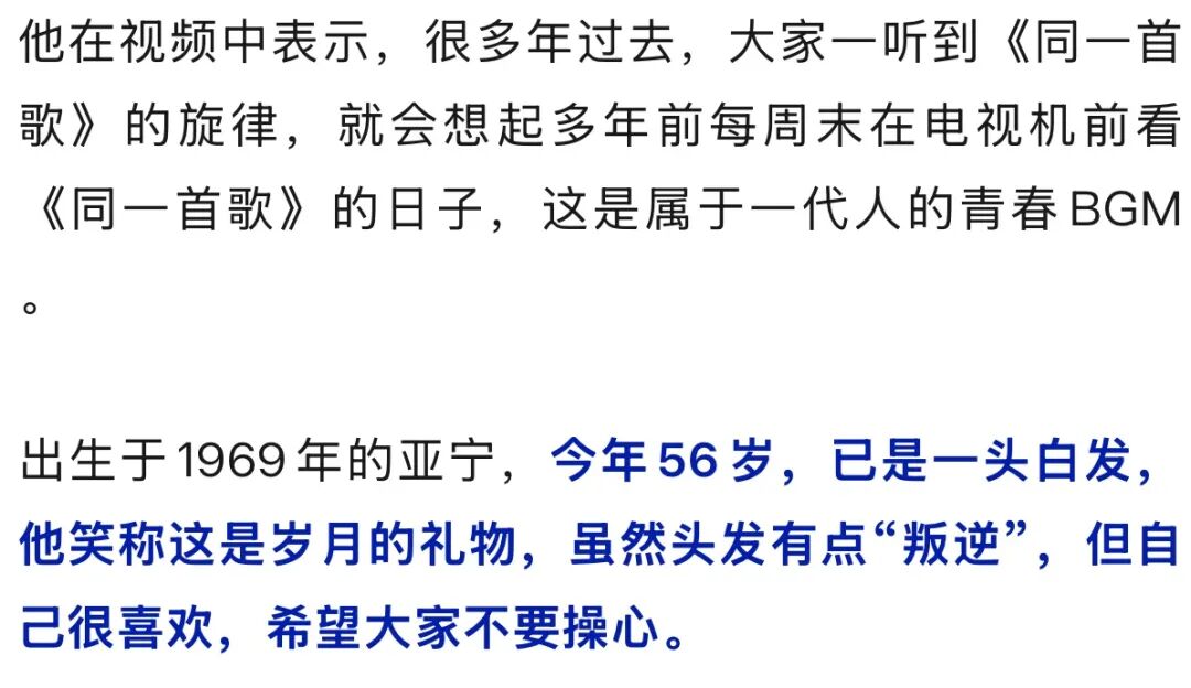 亚宁的回归吸引了大批曾经的电视观众,他们纷纷在评论区回忆当年看《同一首歌》的场景,还有人点赞,“法拉利老了也是法拉利”“我一直觉得他是央视最帅主持人”。