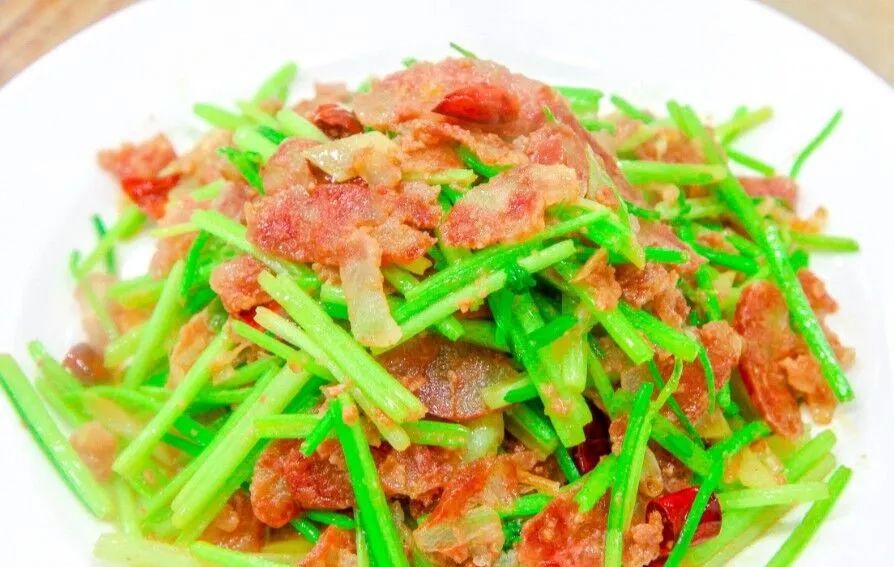 3、在热锅中加入适量的植物油,倒入葱、姜和红干椒,快速翻炒至香味四溢。随后,加入腊肠片,快速翻炒几下后淋入料酒,使料酒与腊肠充分融合。接着,倒入焯水后的芹菜,继续以大火翻炒。