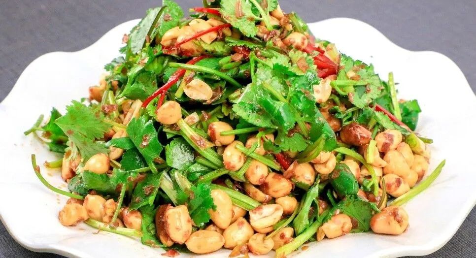 5、开始调味:在大碗中加入炸好的去皮花生米,撒上切好的香菜段,倒入蒜末和红椒丝。然后,加入适量的食盐、味精、生抽、陈醋和香油,用筷子或勺子搅拌均匀,使调料充分渗透入花生米中。最后,将拌好的花生米装盘即可。