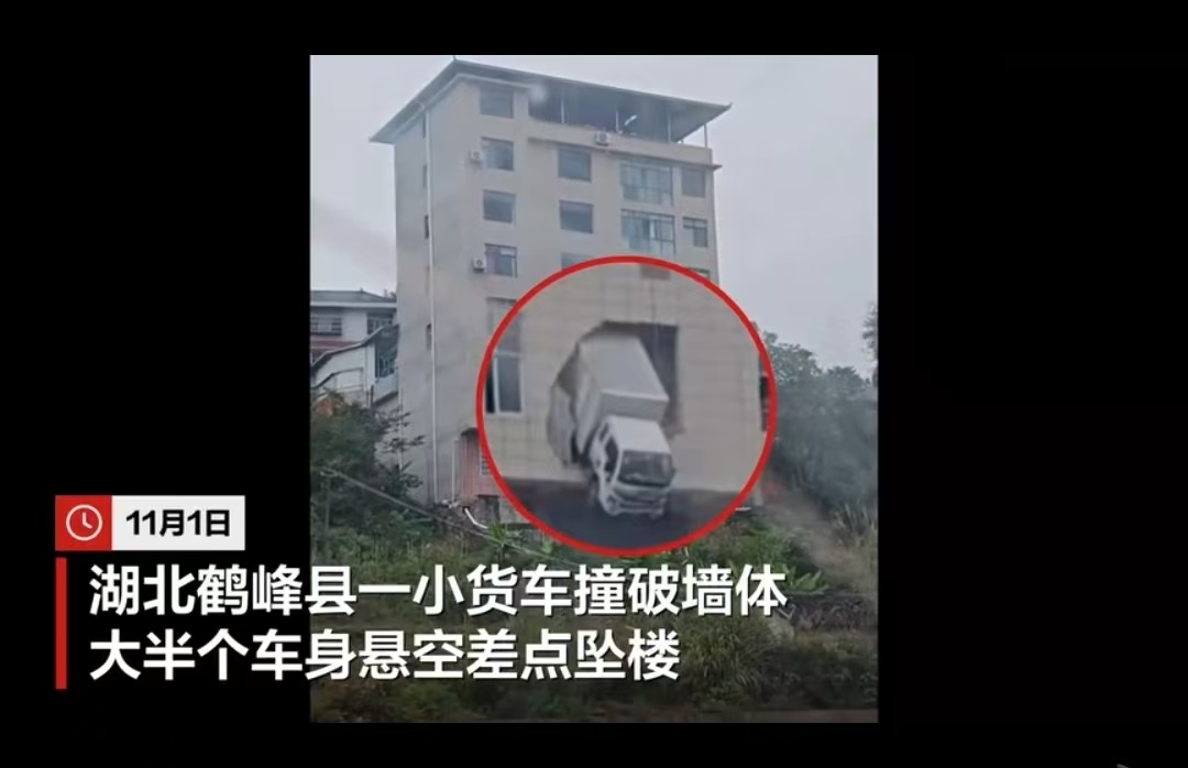 湖北一小货车撞破房屋墙体,车身悬空险坠楼,多方回应