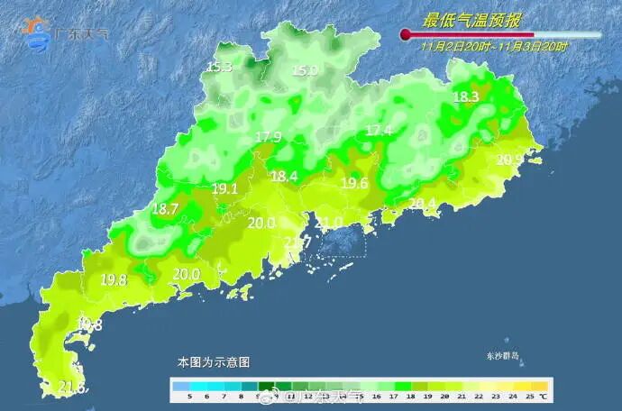 据@广东天气 预测,11月3日,弱冷空气持续补充扩散影响,广东大部多云间阴天,部分市县有分散小雨,各地气温逐日略有下降,早晚体感清凉;4日受高空槽东移和东南气流辐合影响,西部市县阴天有中到大雨,其余大部市县阴天有小雨;5日,全省大部小雨转多云。