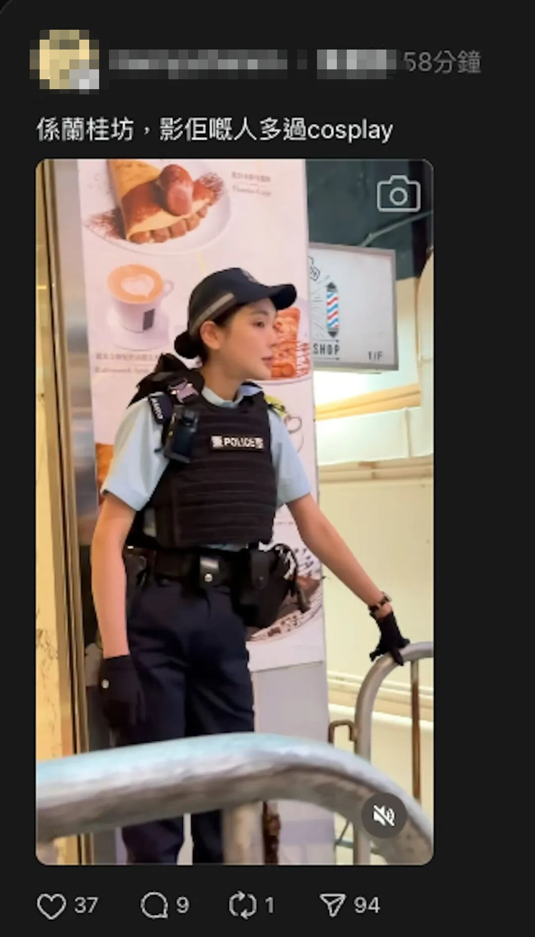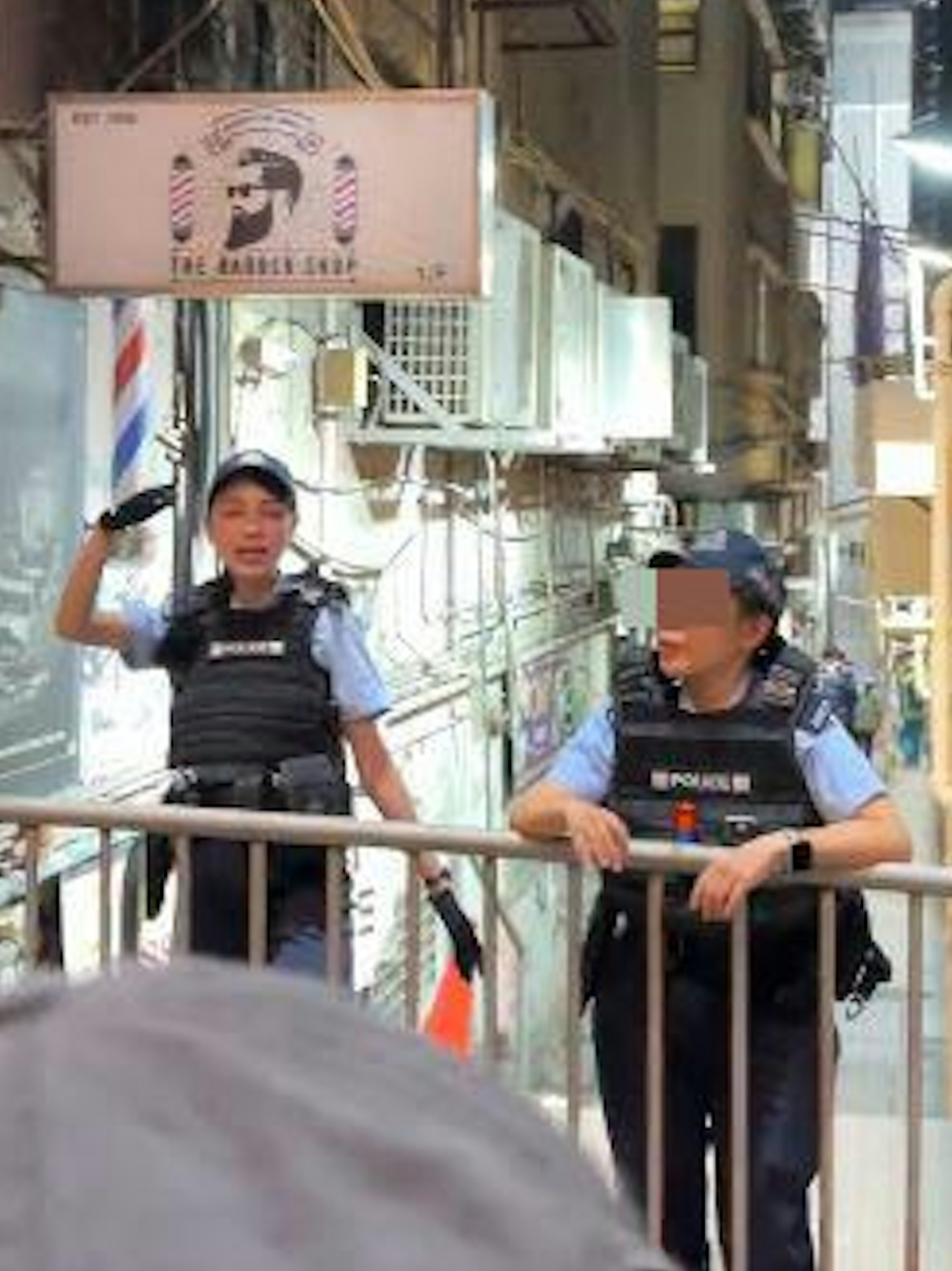 视频可见,这位“仙气女警”站在兰桂坊的一条巷子前,穿着整齐的制服,与一名女警搭档执勤。