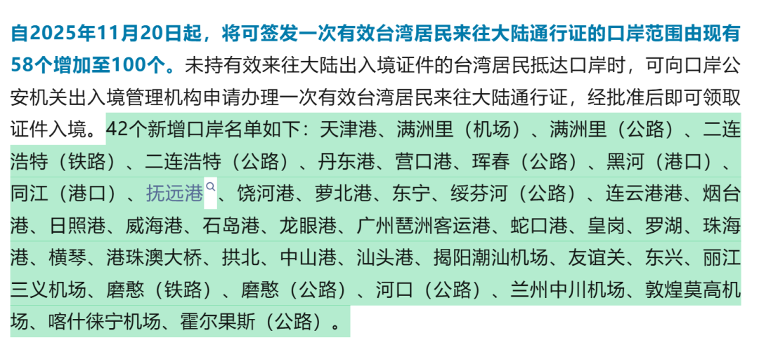 11月20日开始,能签发有效台湾居民“一次有效入境证”的口岸由58个增加到100个。
