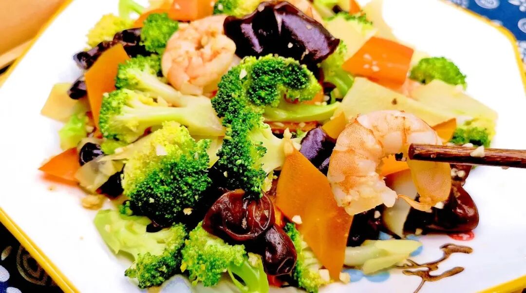 推荐食谱:西兰花胡萝卜黑木耳拌虾仁