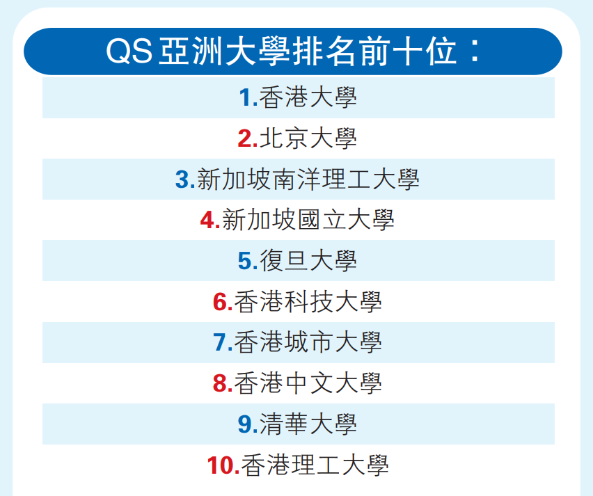 国际高等教育研究机构Quacquarelli Symonds(QS)发布了《2026年QS世界大学排名:亚洲版》,香港院校表现优秀,共有5间大学打入亚洲10大;香港大学在相隔15年后,重返亚洲第一的位置。