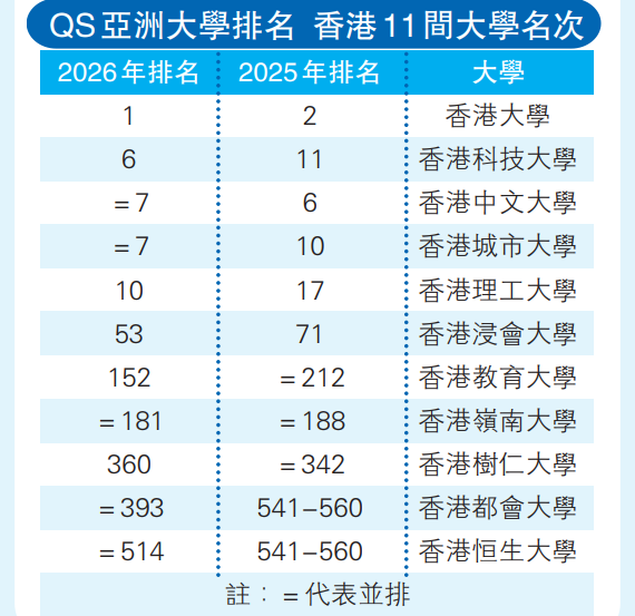 《2026年QS世界大学排名:亚洲版》涵盖了25个高等教育体系中的1529间大学,其中558间是首次登榜。香港再有两间大学成功进入顶尖行列。科大从第11位上升至第6位,而理大则从第17位上升至第10位。总体而言,香港11间大学在排名中表现不俗,其中9所大学排名都有上升,只有2间排名略跌,分别是中文大学及树仁大学。