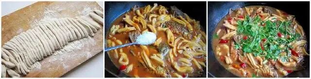 野生的小鲫鱼怎么吃都是非常鲜美的,今天中午就做了一盘鲫鱼炖面,吃的光光的,美味极了。 这面看着像剪刀面,其实比剪刀面操作起来还快又易学。相信不会做面食的人学起来也没困难。这道菜里的面吃起来非常有劲道。 【食材】鲫鱼300克、面粉160克、红干椒5个、蒜头5瓣、葱3棵、香菜2棵、花椒3克、酱油少许、姜片3片 【做法】 1、准备好面,加少许开水和面和成光滑的面团,放置10分钟,记住一定要开水和面,这样面吃起来会口感劲道。 2、准备所需食材 3、葱姜蒜辣椒切好备用 4、鲫鱼去腮取出内脏,去掉内部黑膜,并清洗干净 5、将每条鲫鱼裹上面粉,多余面粉抖掉,裹面粉煎的鱼吃起来更香,是这道菜好吃的关键,别偷懒怕麻烦哦 6、锅烧热,倒入一碗油,放入鱼,将锅拿起慢速摇晃,让每条鱼都浸上油,不要急着用锅铲翻,继续摇晃锅子,鱼煎好自动会随着锅子的摇晃不粘锅和跟着锅移动,这时候就可以用锅铲把鱼身翻过来继续用同样方法煎另外一面 7、鱼煎至两面金黄 8、倒出锅内多余的油,然后倒入少许酱油、料酒焖几秒钟 9、放入姜蒜辣椒,注入适量的水,开慢火炖 10、在炖鱼的时候,开始将面团取出蘸上干面粉再次揉一揉,拍成长的后面团,用刀切成小粗条,洒上面粉抖开即可,可以防粘在一起 11、鱼炖好,下入面片疙瘩,加入一勺盐煮开 12、关火,放入葱和香菜,装盘 【小贴士】 1、面劲道好吃关键在用开水和面、醒面 2、煎鱼不破的技巧仔细看第六步操作,这可是煎鱼不破的技巧,果子全都告诉你啦 3、炖鱼汤水不要太少,我放了3碗水。 来源:千厨百味、如有侵权请联系删除