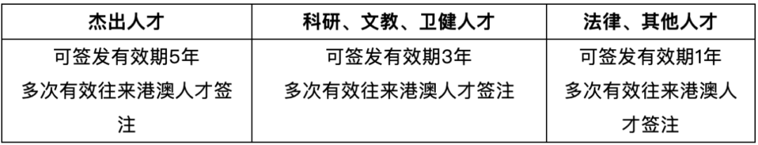 自2025年11月5日起,在北京、上海、粤港澳大湾区的基础上,在长三角、京津冀地区全域,以及全国所有自由贸易试验区实施往来港澳人才签注政策。在上述区域工作的内地杰出人才、科研人才、文教人才、卫健人才、法律人才以及其他人才,可凭人才主管部门、符合条件的用人单位等出具的有关人才证明,申请办理有效期1至5年不等的多次往来香港或者澳门人才签注,每次在香港或者澳门停留不超过30天。