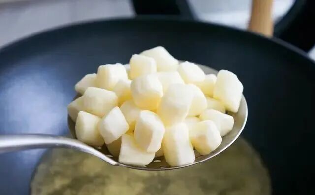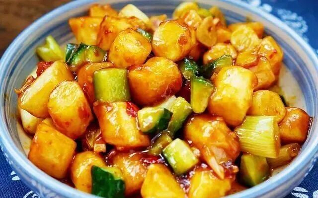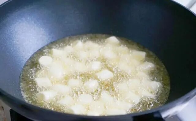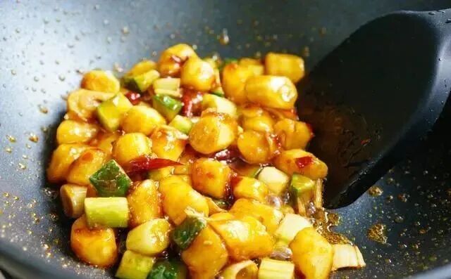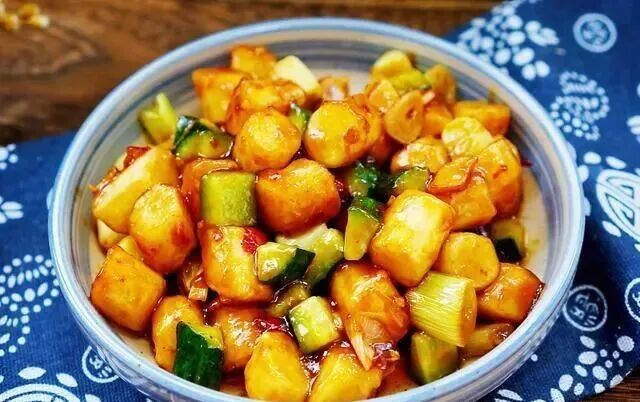 今天做了一道宫保山药,好吃下饭,全家都爱吃。宫保山药与我们都熟悉的宫保鸡丁做法类似,只不过是用山药代替了鸡肉。做出来的宫保山药不仅味道鲜美,营养价值也更高。 这道菜的做法并不复杂,由于山药是炸过的,色泽金黄亮丽,用干红辣椒炒制,口味绵软,香甜中带着微微的辣味,非常下饭。 【宫保山药】 所需食材: 山药1根,大葱1根,黄瓜1根,花椒少许,干辣椒适量,郫县豆瓣酱适量,姜片蒜片适量,食用油适量,1克盐,2勺酱油,3勺醋,4勺白糖,5勺水,3勺玉米淀粉 做法: 1.山药去皮切成小段,放到清水中浸泡5分钟。 2.准备好配菜和调料。调好碗汁,碗中加1克盐,2勺酱油,3勺醋,4勺白糖,5勺水,3勺玉米淀粉搅匀。 3.将浸泡好的山药裹上一层玉米淀粉。 4.炒锅中放入适量的食用油烧热。最近新入手了一款中餐厅同款三禾品牌炒锅,锅底很有质感,上热很快。 5.倒入裹好淀粉的山药块,小火慢炸。炸制过程中基本没有油烟,一点也不粘锅。 6.炸山药的过程不要过长,山药表面形成一层硬壳就可以捞出控油了。千万不要炸时间长了,时间长了山药的口感会非常硬的。 7.另起锅,放入适量的油烧热,倒入蒜片,姜丝和干辣椒,小火煸出香味。 8.倒入郫县豆瓣酱,用铲子快速打散炒匀,炒出红油。 9.倒入葱白段翻炒均匀。 10.倒入炸好的山药和黄瓜翻炒均匀,再倒入调好的碗汁炒匀。这一步火不要太大,火大了调料汁容易结块。关火盛盘。