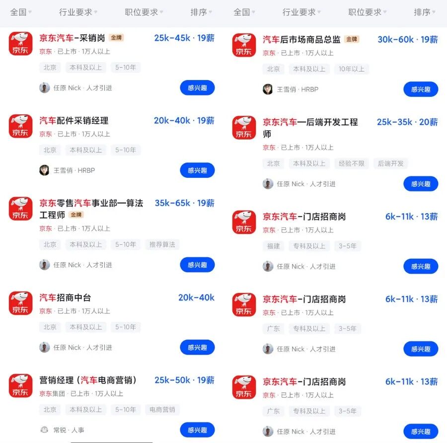 此前,京东已与比亚迪、东风、一汽等头部车企展开过深度合作。不难看出,随着自身业务规模的提升,京东正加码补充算法、营销、采销、供应链管理等人才。
