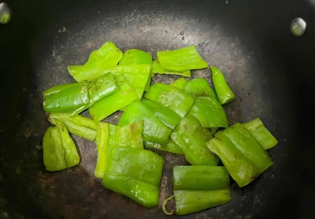 把青椒炒至虎皮状盛出