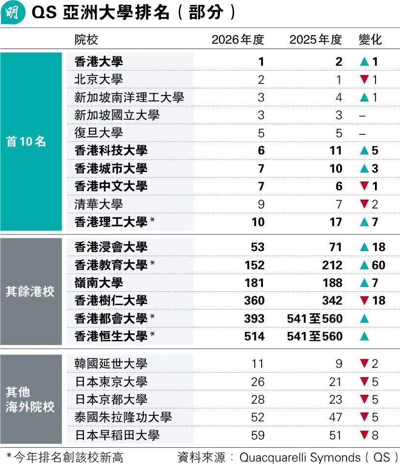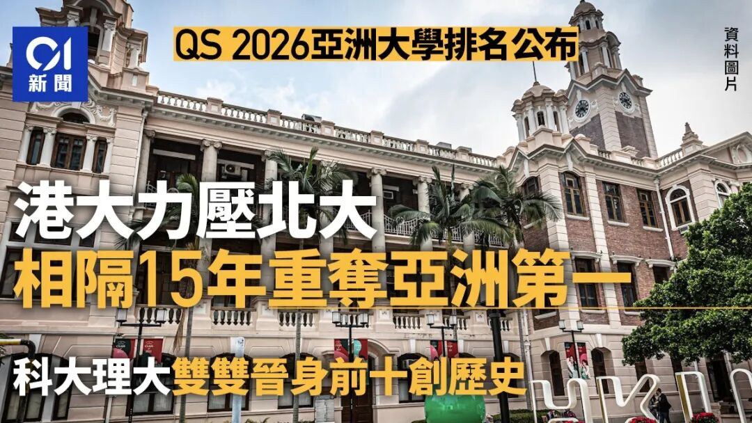 2025年11月4日,国际权威高等教育研究机构Quacquarelli Symonds(QS)发布了备受关注的《2026年QS世界大学排名:亚洲版》,引发学界和社会的广泛热议。香港大学(HKU)时隔15年,再度力压北京大学,荣登亚洲最佳大学宝座,成为当之无愧的“亚洲一哥”!与此同时,香港共有5所大学跻身亚洲前10名,彰显香港作为国际教育重镇的强大实力和无限潜力。