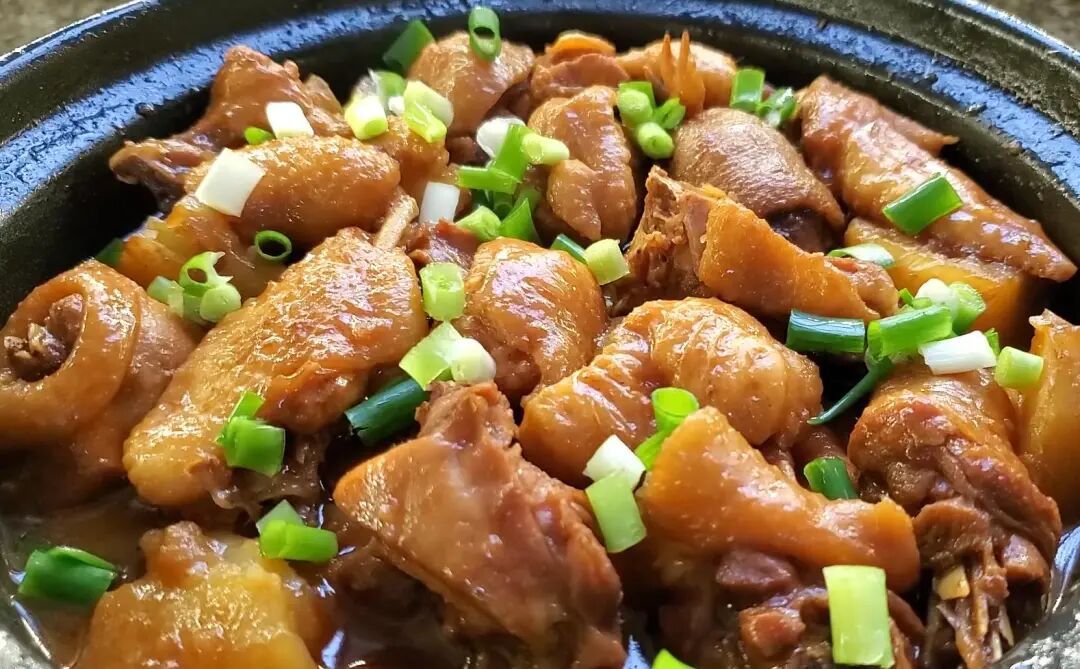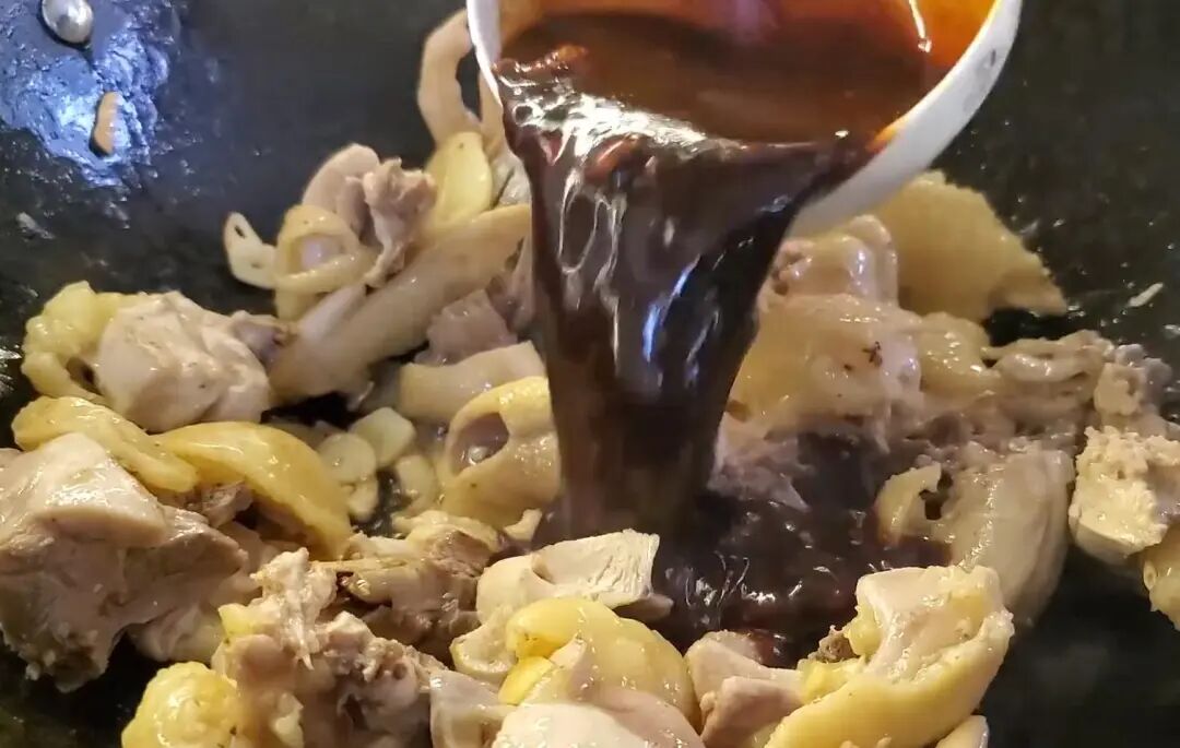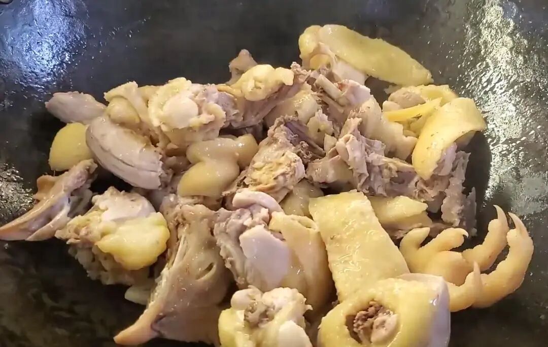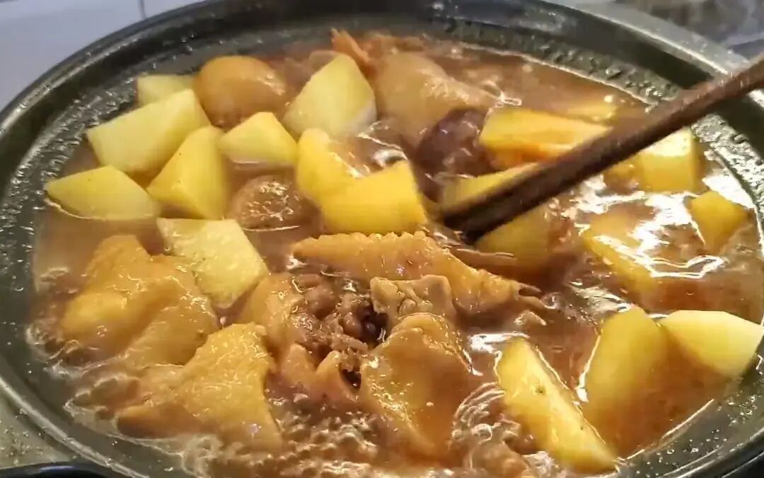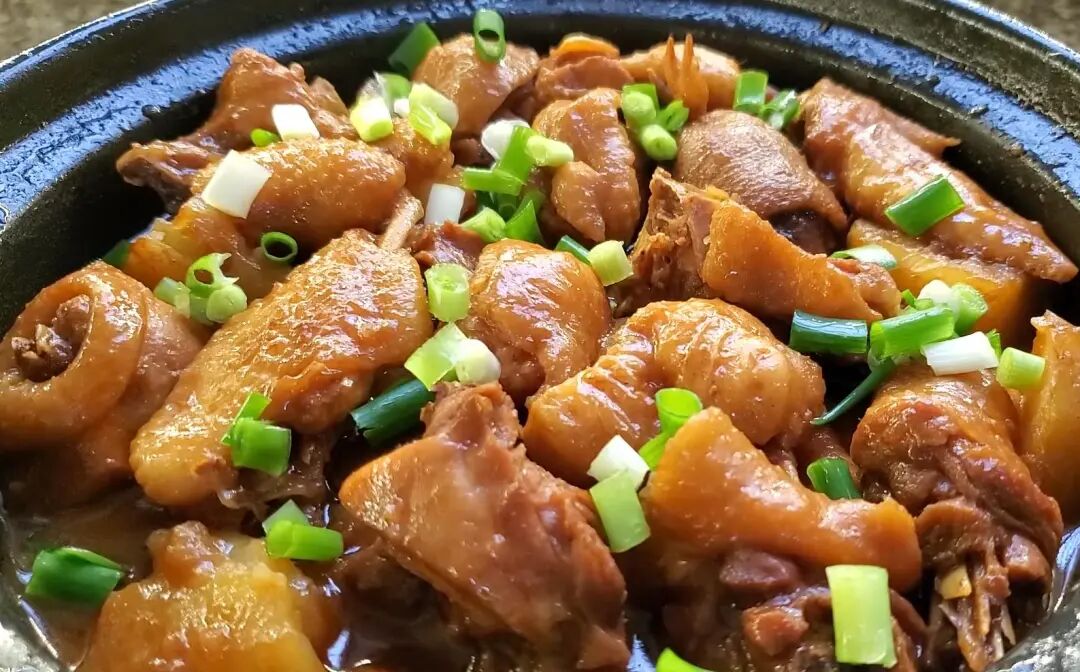 今天给大家分享一个新吃法,一开盖香味扑鼻,肉质软烂入味,一上桌瞬间就被吃光了,汤汁都不剩。鸡肉的这种做法特别的适合天冷吃,来上一锅吃完全身都暖和, 做法: 1,准备好半只公鸡剁成小块清洗干净,鸡块冷水下锅加入姜片,料酒去腥,大火烧开撇去浮沫煮2分钟控水捞出,再用流水冲洗掉表面残留的浮沫。 2,准备好两个土豆去皮切成小块,清洗干净装盘备用,在准备一点大蒜切成蒜片,生姜切片。 3,调一个料汁:碗中加入三勺生抽,一勺柱侯酱,一勺豆腐乳,少许胡椒粉,少许五香粉,一勺蚝油,搅拌均匀备用。 4,起锅倒入食用油烧热下入姜蒜片爆香,炒出香味后下入焯好水的鸡块大火翻炒,炒出鸡肉的香味。 5,炒出鸡肉的香味之后倒入调好的料汁,加入清水没过鸡肉,盖上盖子大火烧开煮10分钟。 6,10分钟后把鸡块捞出倒入砂锅中,把汤汁倒进来加入5克冰糖提味,大火烧开转小火再炖10分钟,10分钟后下入切好的土豆,盖上盖子继续炖20分钟。 7,20分钟后炖到土豆和鸡肉软烂关火,再撒上一点葱花就可以上桌了。这样做出来的鸡肉软烂入味,土豆也充分吸收了汤汁,开胃下饭,超级好吃,每次做只要都要吃三碗米饭。 做法简单,天冷了来上一锅吃完浑身暖和。 来源:千厨百味、如有侵权请联系删除