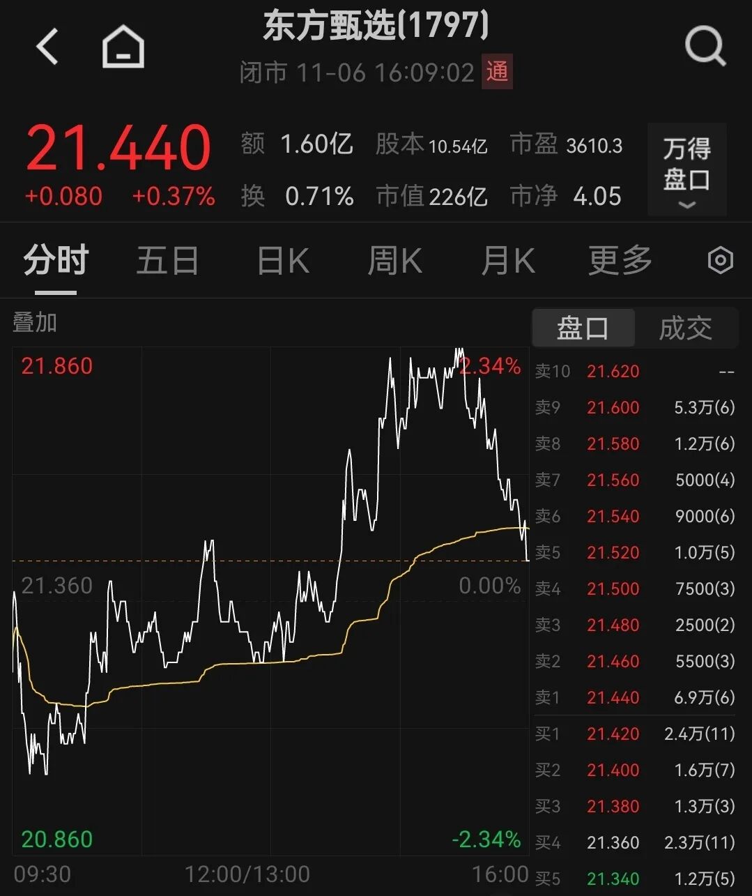 受此消息影响,东方甄选股价尾盘跳水,截至发稿,股价报21.44港元,市值约为226亿港元。(免责声明:本文内容与数据仅供参考,不构成投资建议,使用前核实。据此操作,风险自担。)