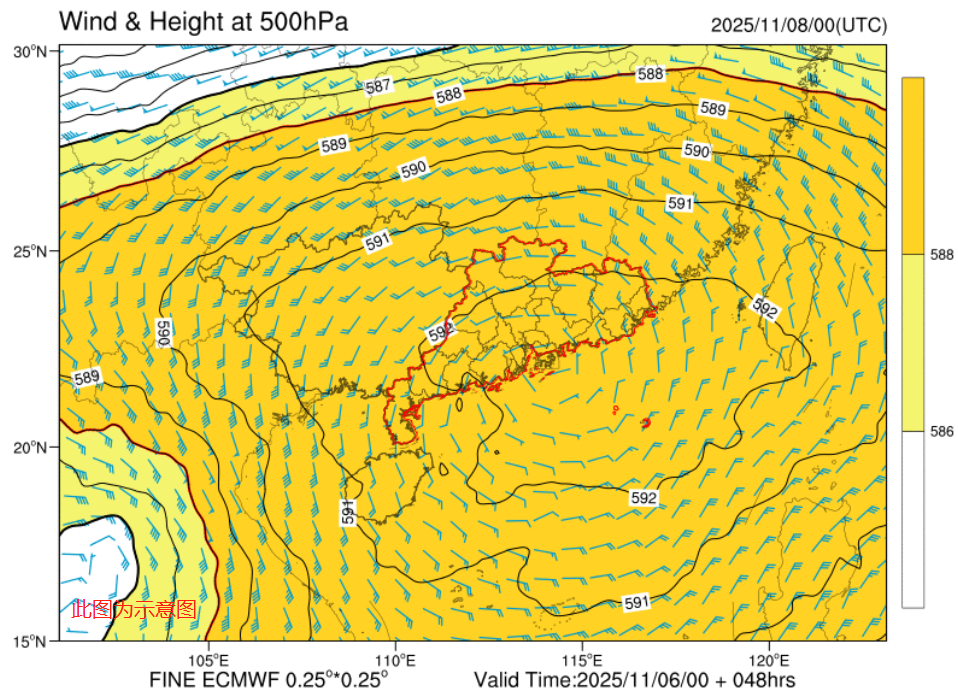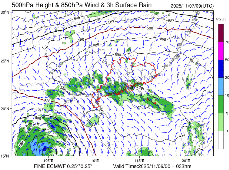 11月7日17时500hPa高度+850hPa风+降水预报图(