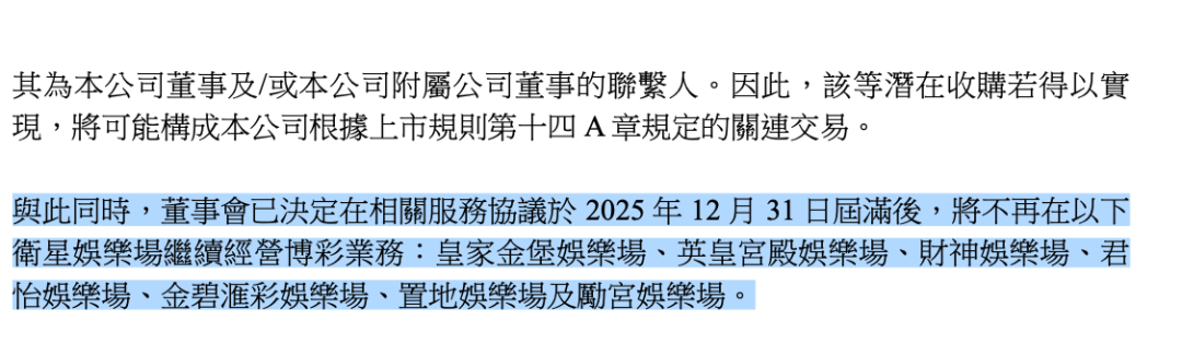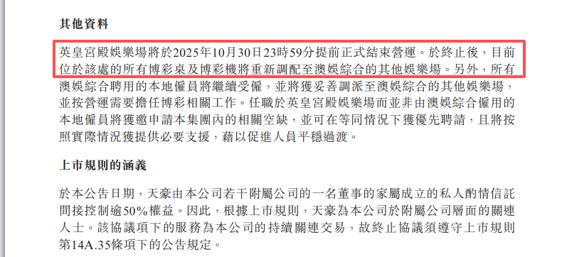 10月27日,澳博控股宣布,澳娱综合与天豪相互同意及订立终止协议,该协议将自2025年10月31日起提前终止。于终止后,天豪将不再向澳娱综合提供服务,英皇宫殿娱乐场于10月30日23时59分提前正式结束营运。