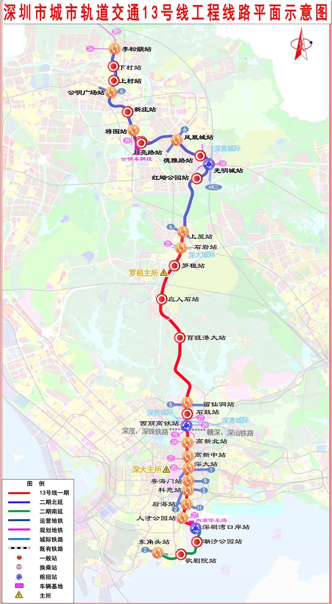 13号线二期(北延)起于 宝安区上屋站(不含),止于 光明区李松蓢站。